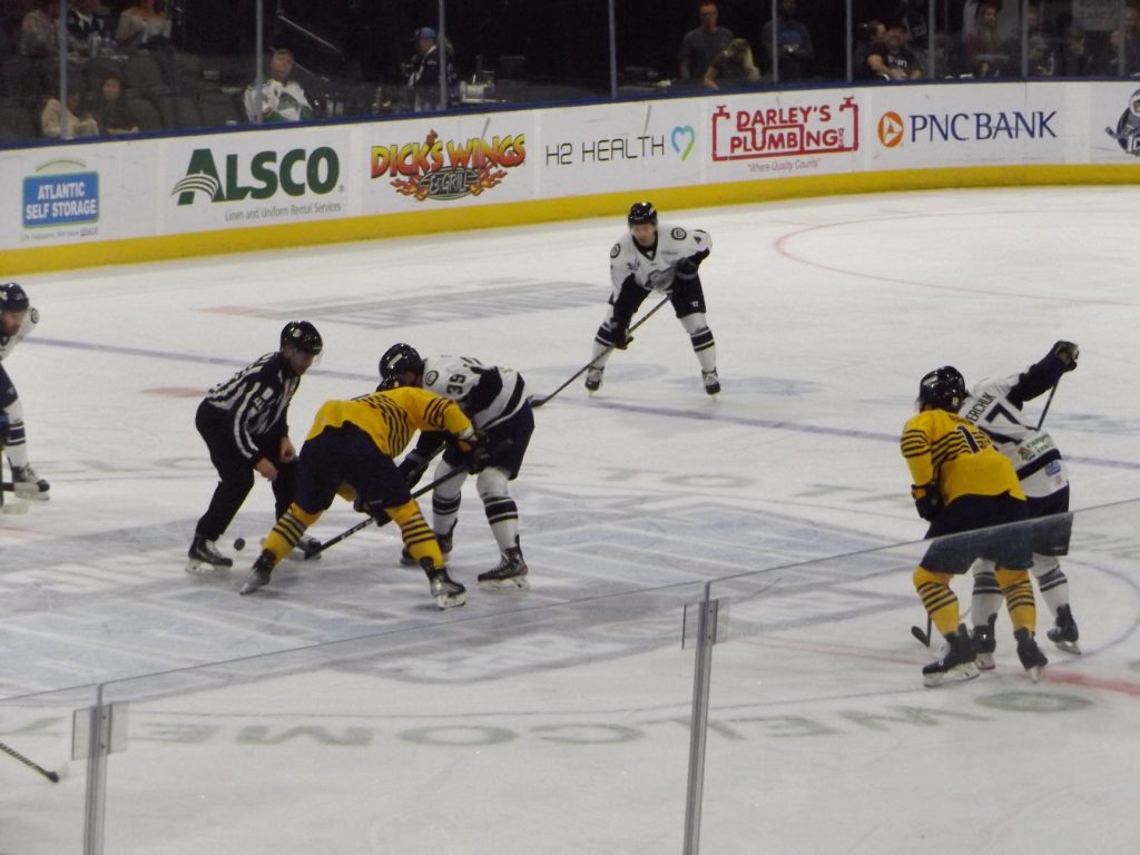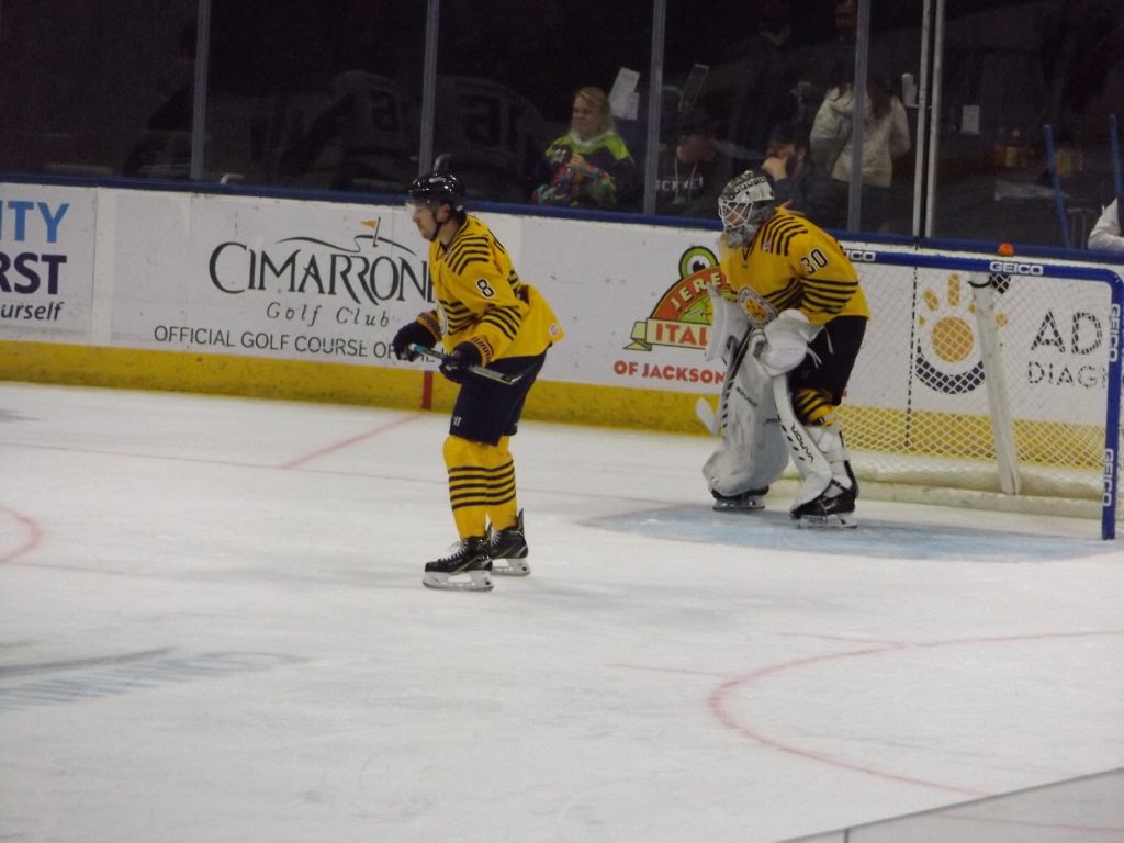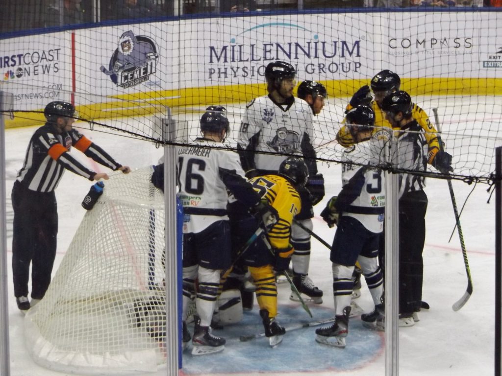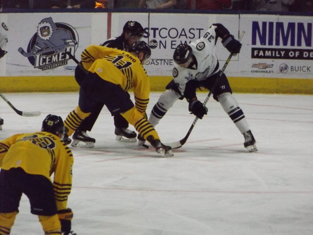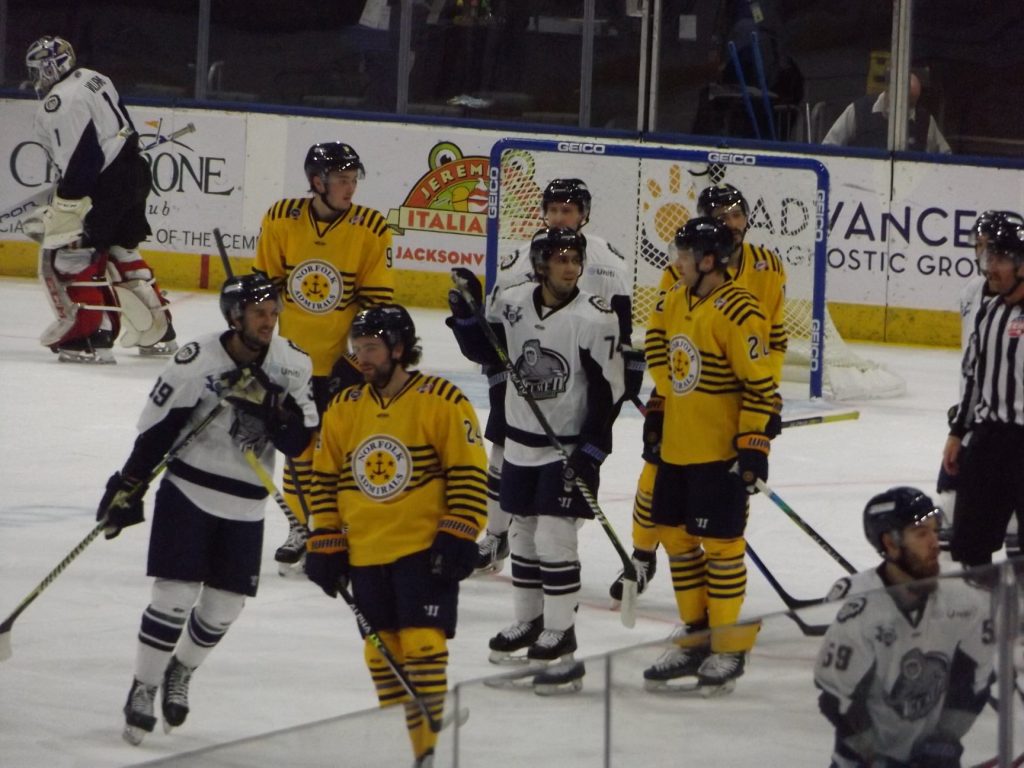 The Icemen dominated the first period, outscoring the Admirals 3-0 to take control. The scoring began at the 3:32 mark when Brandon Fortunato set up James Sanchez for a shot over Norfolk goalie Dylan Wells for his seventh goal of the season. A couple of minutes later, it was Luck Lynch’s turn as he grabbed the rebound of a shot by Craig Martin and stuffed it home for his eighth of the year. Jacksonville then finished the frame when Jake Elmer made a pretty behind the back pass to the slot where Abbott Girduckis fired it home for his 14th goal.