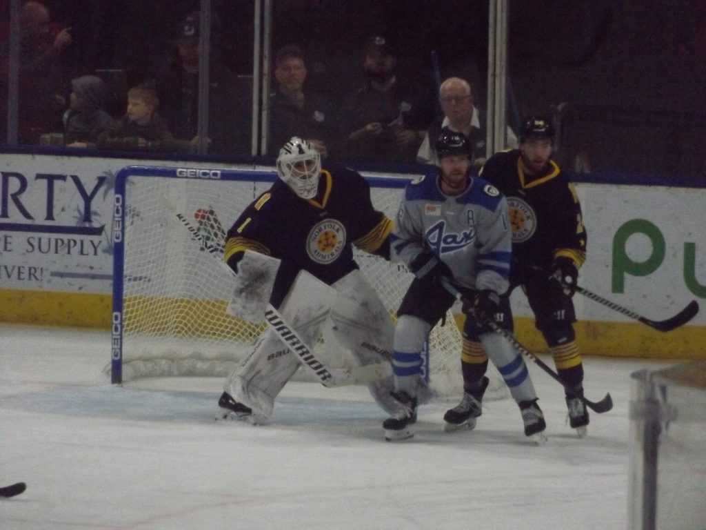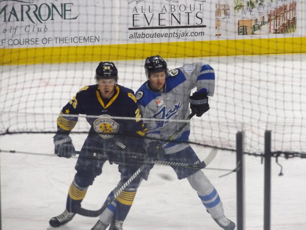 Moments later, Lynch completed the hat trick bid at 11:37 of the period. Craig Martin steered a pass across slot to Lynch at the left-wing circle. Lynch wristed the puck low on the ice that slid into the Norfolk net for the go-ahead marker to the put Jacksonville ahead 5-4.