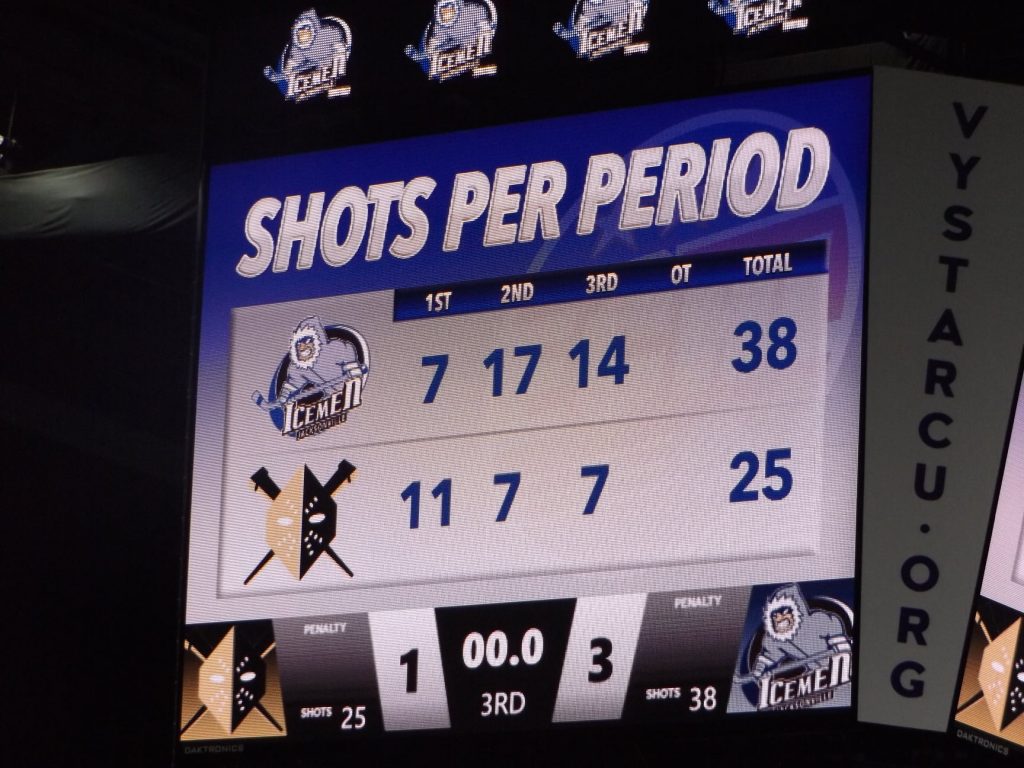 The Icemen got on the board first 7:19 into the second. Seconds after a power play ended, Jacksonville continued to press and out of a scramble in front, Girduckis grabbed the rebound of his own blocked shot and elevated the puck over Wheeling goalie Shane Starrett for his 9th goal of the season.