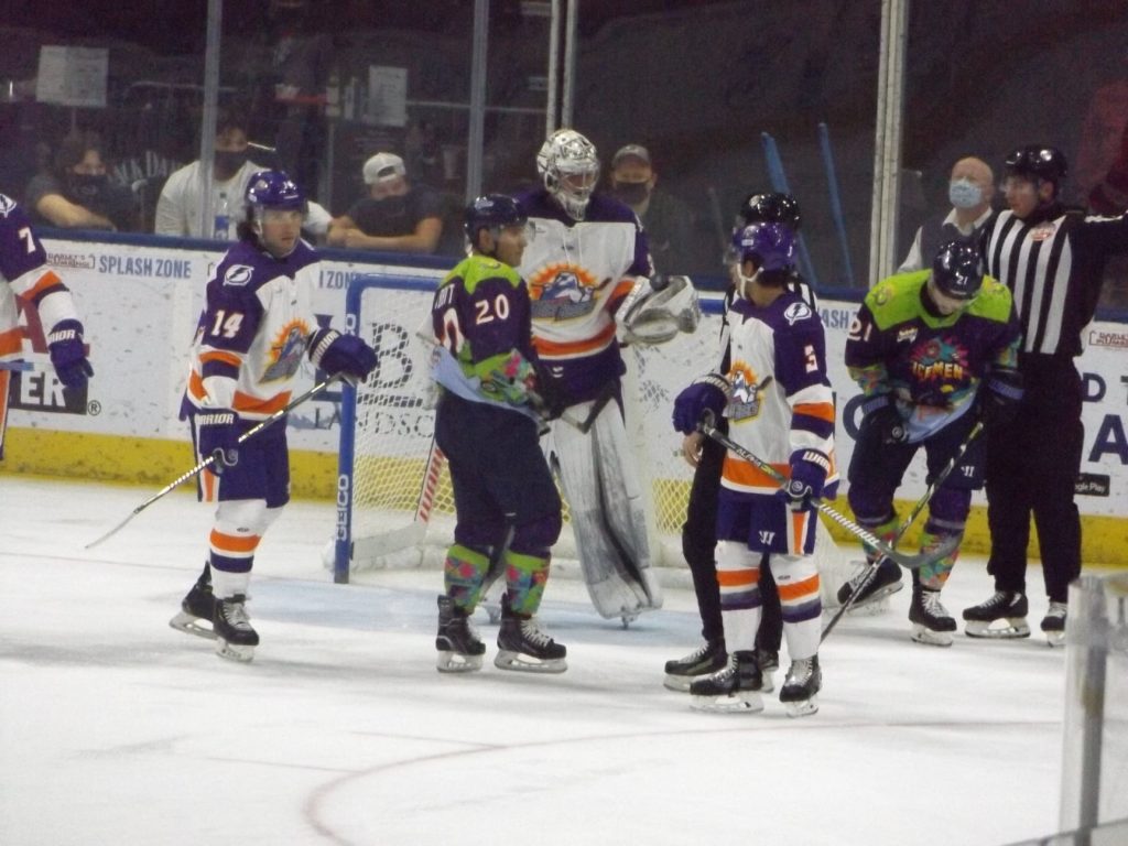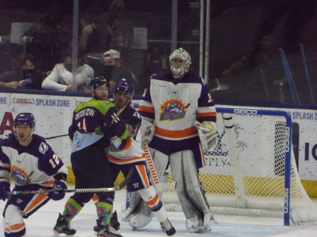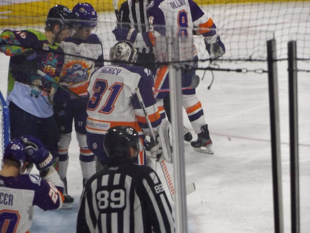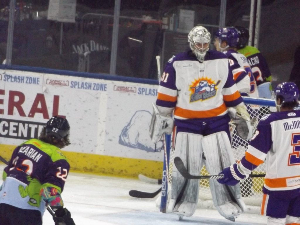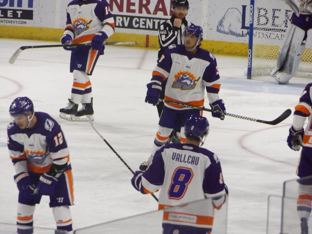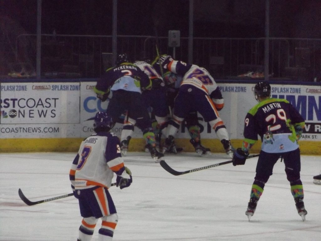 Scoring in the fifth meeting of the season between the two Sunshine State rivals started a little past the midpoint of the first period when the visiting Solar Bears notched a power play tally off the stick of Aaron Luchuk. Luchuk converted the rebound of a shot by teammate Jake Coughler for his sixth goal of the season to put Orlando up 1-0.