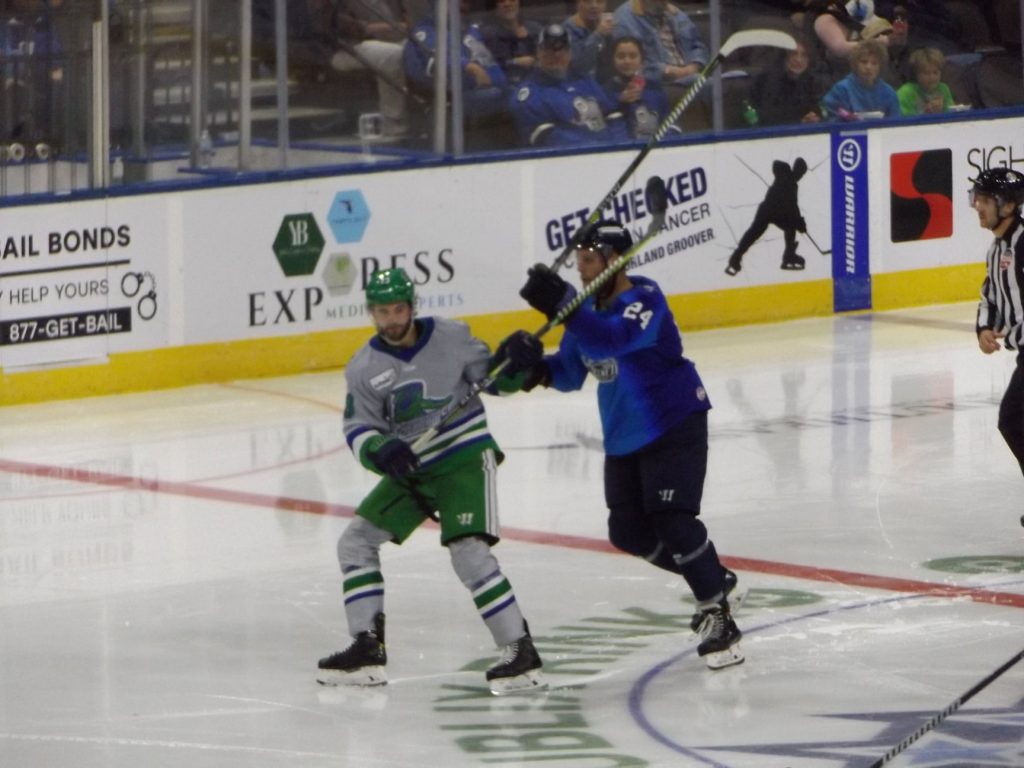 Both teams started off the game trying to gain an edge in momentum and offensive zone pressure. The Everblades started to gain momentum early and used that to drive the play in their favor. Florida scored early off of an odd man rush and eventual shot from Aleardi the slot to take a one goal lead.