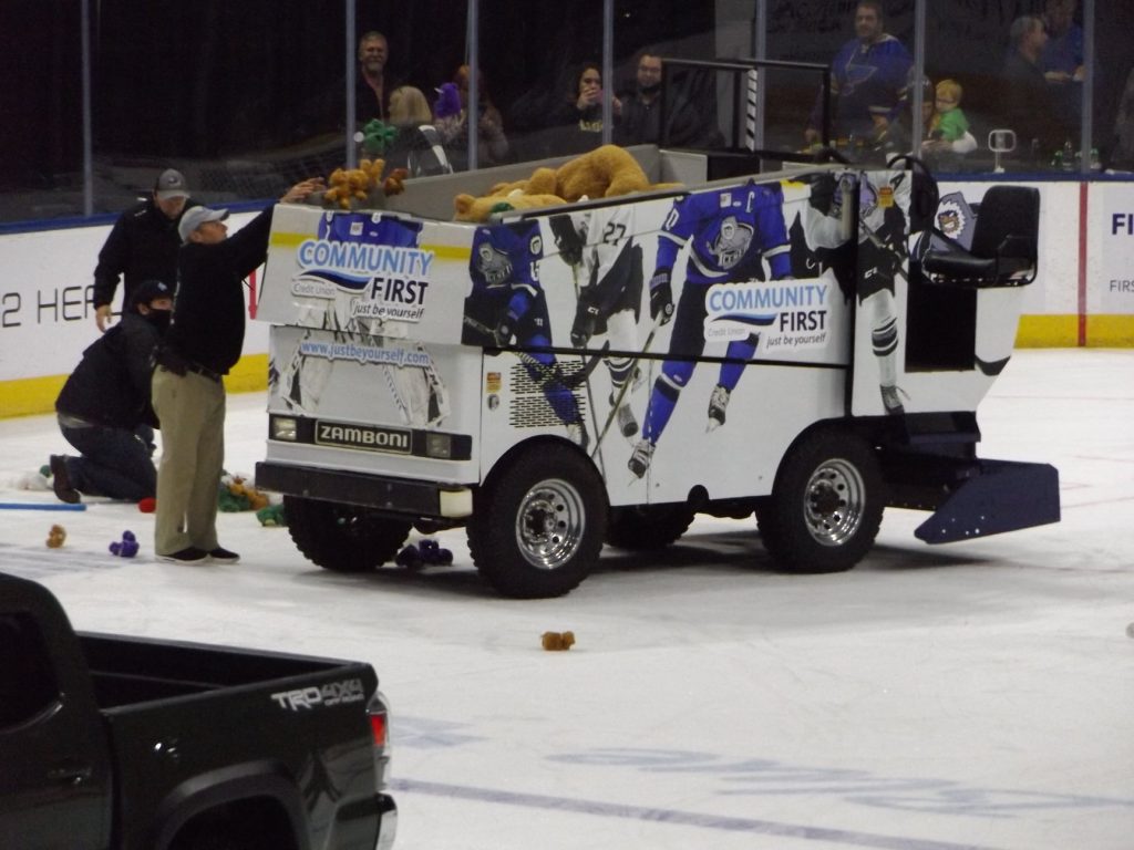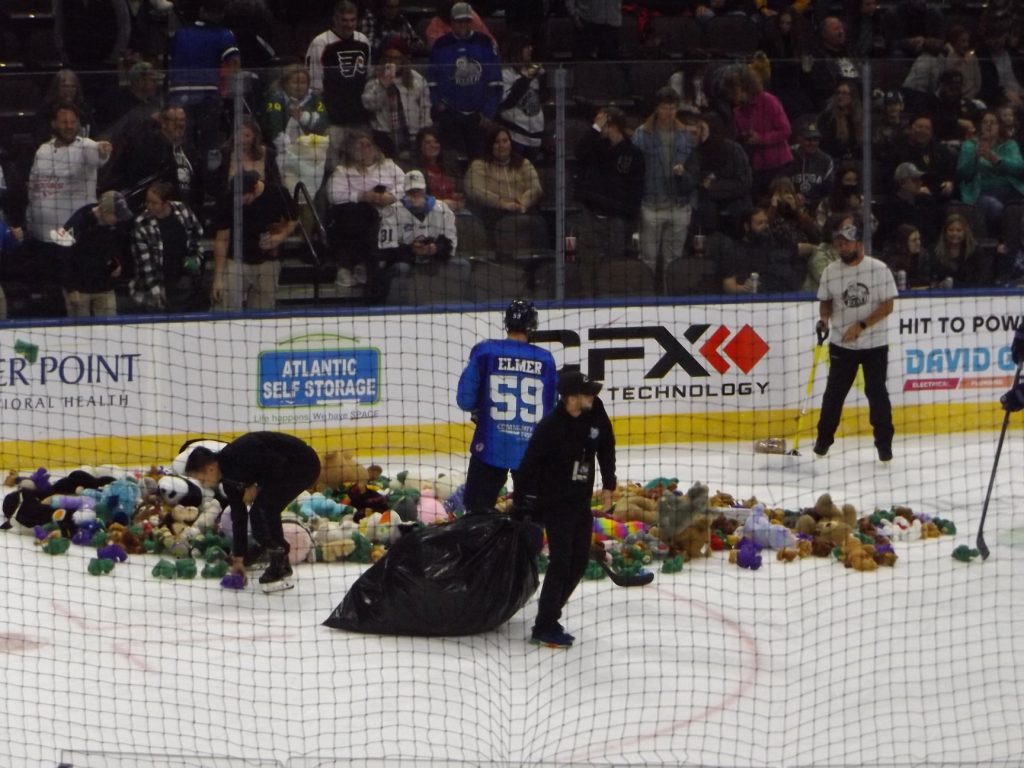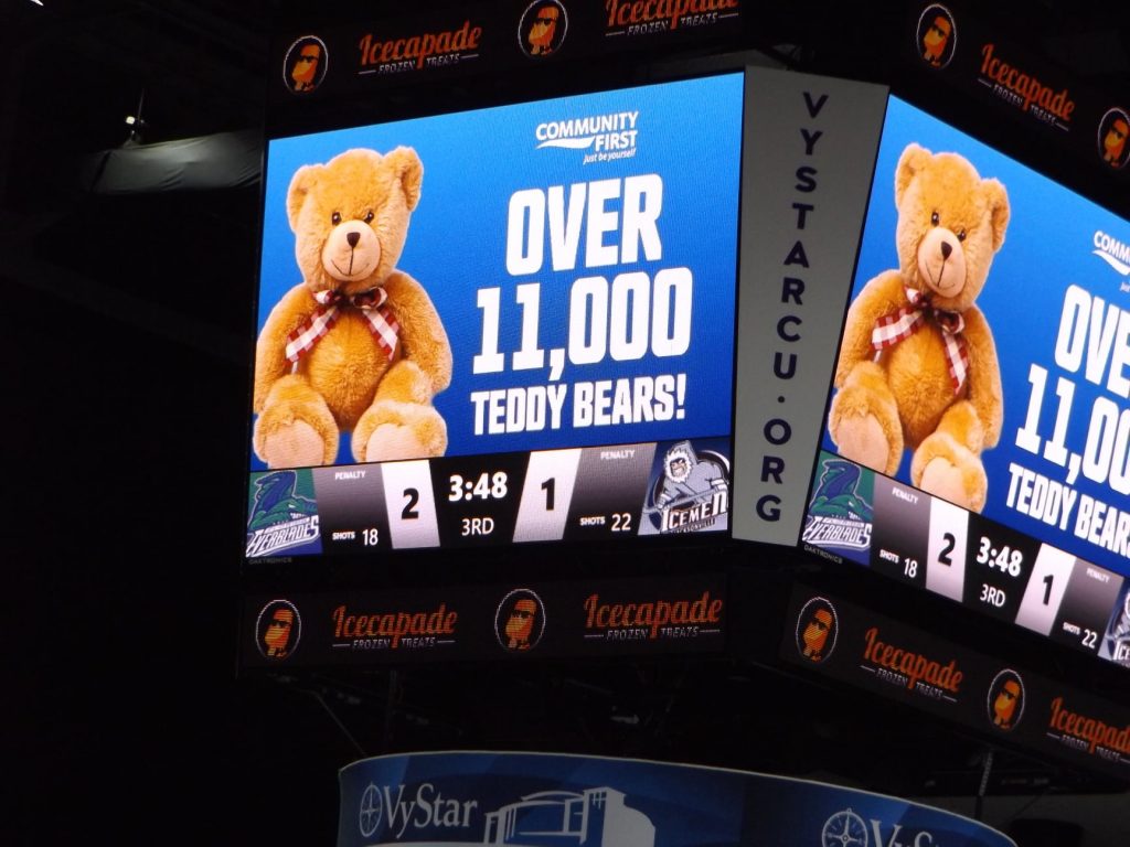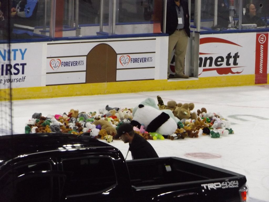However, at the end of the period Icemen forward Jake Elmer rushed the puck up the ice and made a nice cross crease pass to forward Lynch who batted the puck into the back of the net to pull Jacksonville with one. The goal ignited a celebration of thousands of plush toys for the Annual Teddy Bear Toss.