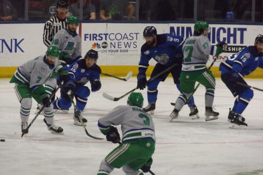 Irvine got the scoring started for the Everblades at 9:13 of the first period, backhanding home a blocked shot taken by Zach Uens for his fifth goal of the playoffs. Cam Darcy also picked up an assist as Florida pulled ahead 1-0 with the team’s first lead since closing out their Game Three victory over Jacksonville in Estero. The Blades controlled the game’s first 20 minutes, outshooting the Icemen 11-5 and successfully killied off Jacksonville’s sole power-play opportunity of the period.