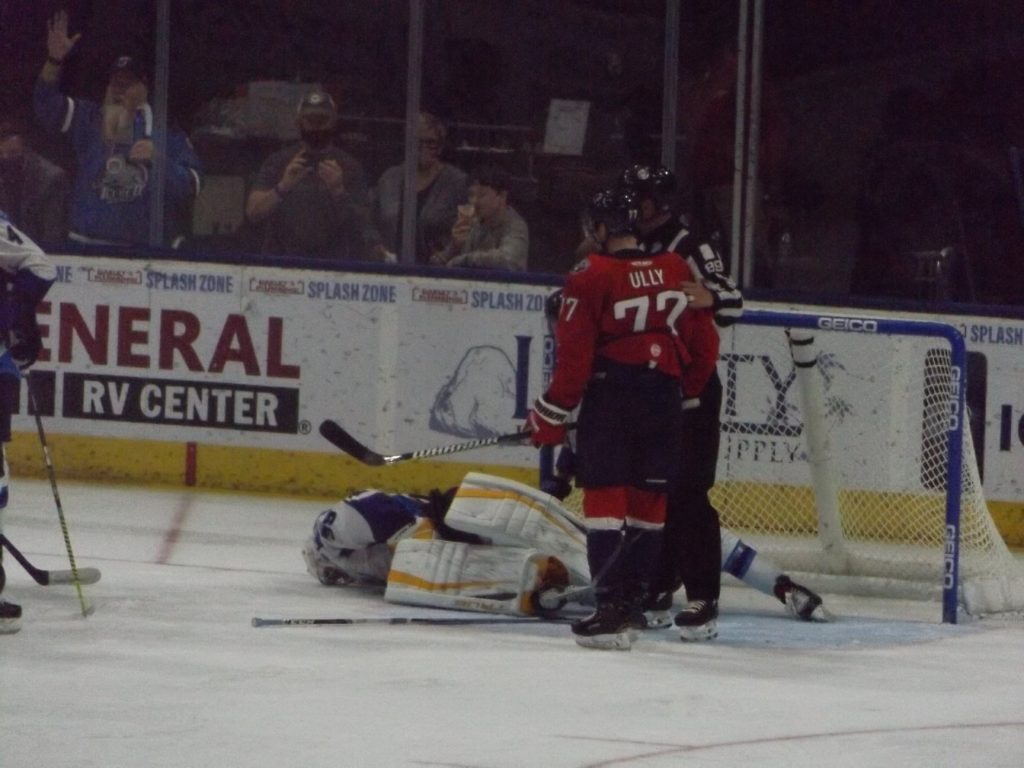Dylan Steman scored for the Stingrays off of another broken play, which resulted in the puck taking a crazy bounce off the end boards. Stemen collected the puck off the boards and hurled a shot that beat Keyser to make it a 3-1 game.
