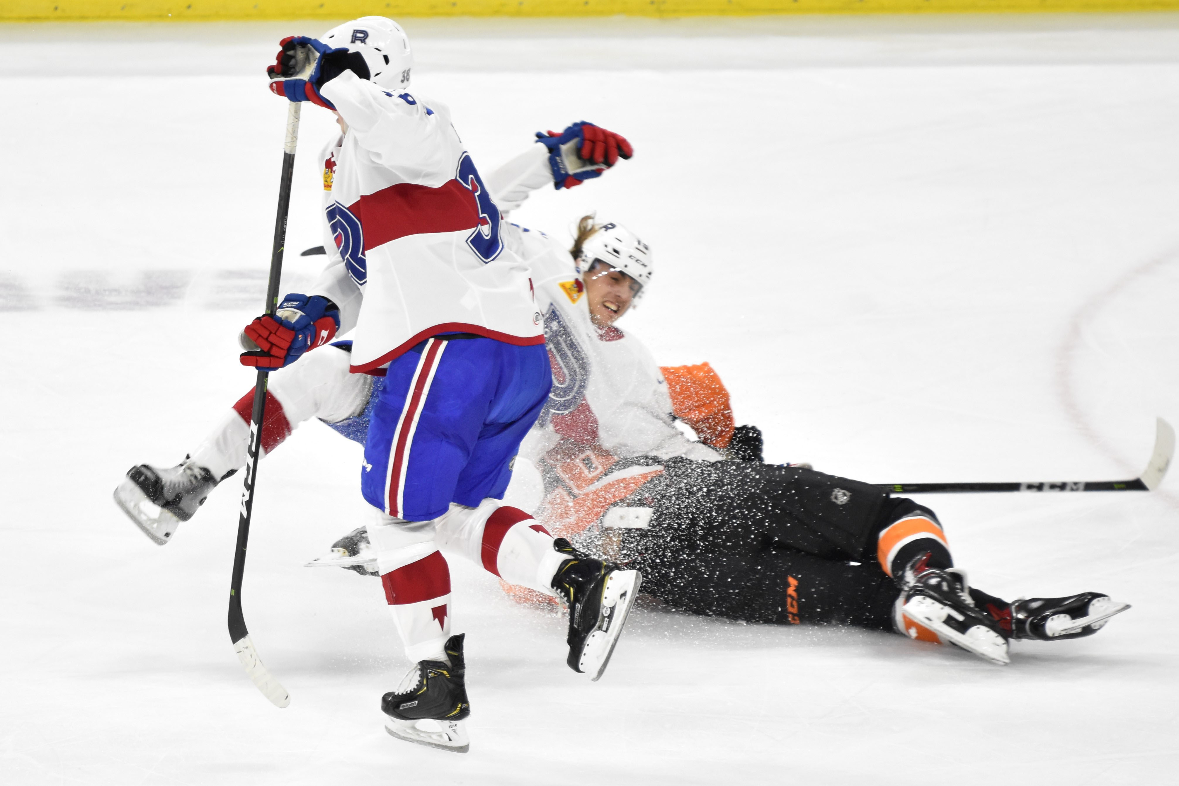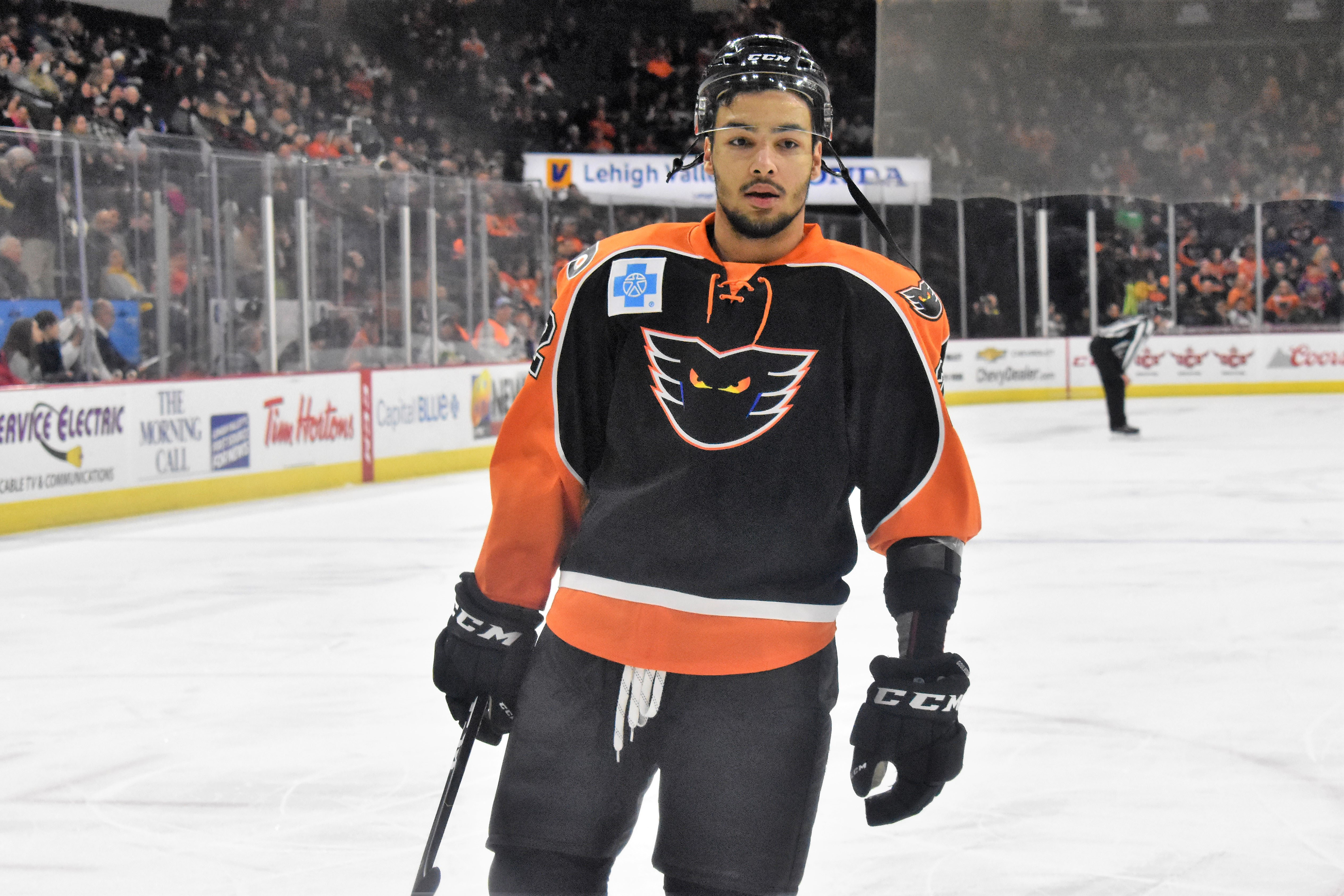 The intensity picked up as Tyrell Goulbourne dropped the gloves with Antoine Waked after Waked was called for charging Mark Friedman. Goulbourne leads the Phantoms with five fighting majors this season.