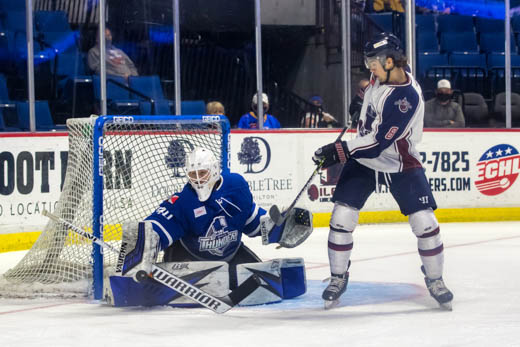 The Thunder answered quickly in the third period, scoring 3:29 in thanks to Garret Schmitz. Dean Stewart finished off a tic-tac-toe goal, bringing the Thunder ahead less than two minutes later. Gates tied the game 2-2 with 4:47 remaining, toe-dragging the defenseman before roofing the puck over Weninger.