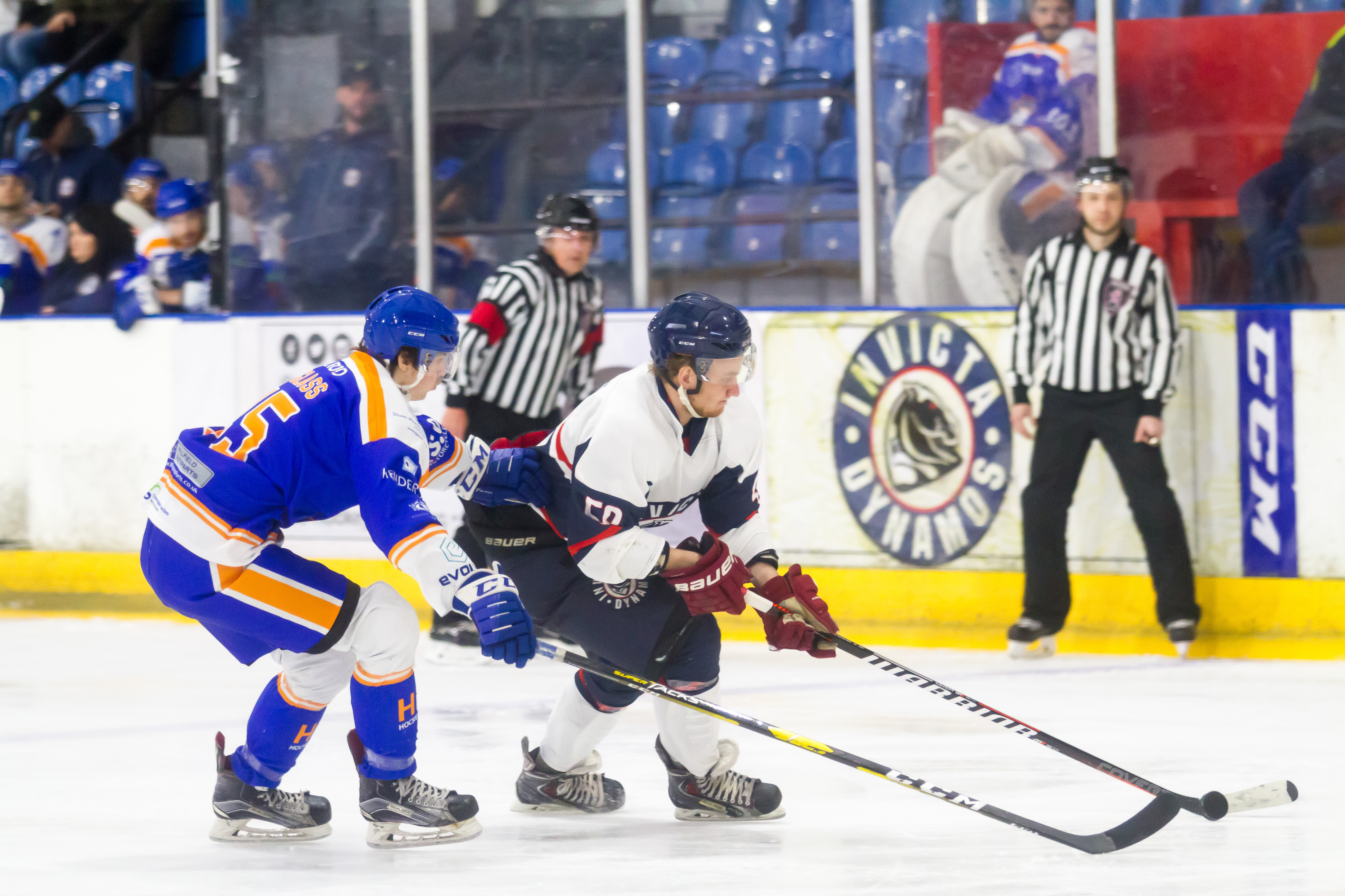 Down the other end Oskars Ancitis showed Joe Edwards who was boss with a huge hit into the boards behind the play. Thunder players were not happy, but the officials did not see the Invicta forward’s check. Not long after, Ancitis checked Edwards again dispatching the Thunder player to the ice once more. Moments later Thunder’s Sam Talbot was sent to the box for a two-minute interference penalty – the young forward had checked Dell who fell head first into the boards and Dynamos were not happy with the hit on their young player. Despite this the penalty gave the hosts a powerplay opportunity and Strawson sent a rocket slapshot into the roof of the net from the blue line for 4-3 at 50:30.
