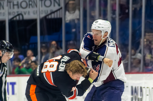 Kansas City Mavericks defenseman Hudson Wilson (18), Tulsa Oilers defenseman Mike McKee (24)