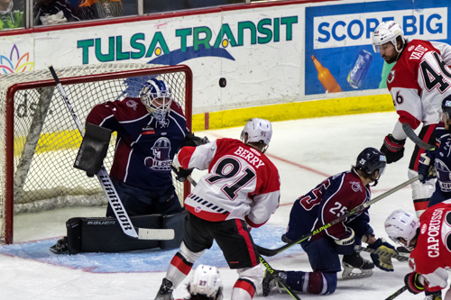 Tulsa Oilers goalie Riley Morris (1), Cincinnati Cyclones forward Matt Berry (91), Cincinnati Cyclones forward Louie Caporusso (23)