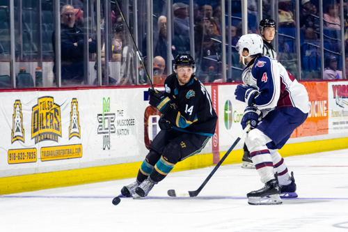 Tahoe Knight Monsters forward Connor Marritt (14), Tulsa Oilers defenseman Konnor Smith (4)