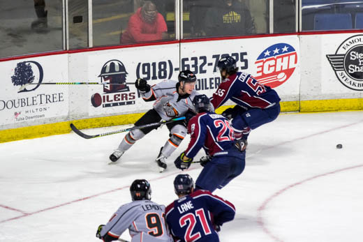 The Oilers are back in action tomorrow night at the BOK Center at 7:05 p.m. for Tulsa-918 Night. The Oilers will be wearing Tulsa flag inspired jerseys, which will be auctioned off after the game in the Riverspirit Lounge. Tulsa closes out the week with an away game at Cable Dahmer arena on Saturday.