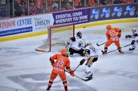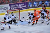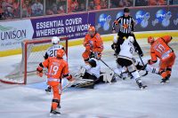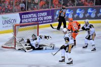 Mark Matheson’s block fell kindly to Tanner Eberle who doesn’t miss from the slot too often as Sheffield tied the game at 21:54. Three minutes later however the Panthers were back ahead with Sam Herr poking home a rebound from close range after Jake Hansen patiently waited and faked a shot before shooting on Tomáš Duba. With 28:40 on the clock, the Panthers made the most of a turnover in the offensive zone allowing Julian Talbot to set up Dylan Malmquist with only 28:40 played. Things got worse for the league leaders when Brett Perlini cracked a shot into the top corner at 34:18.