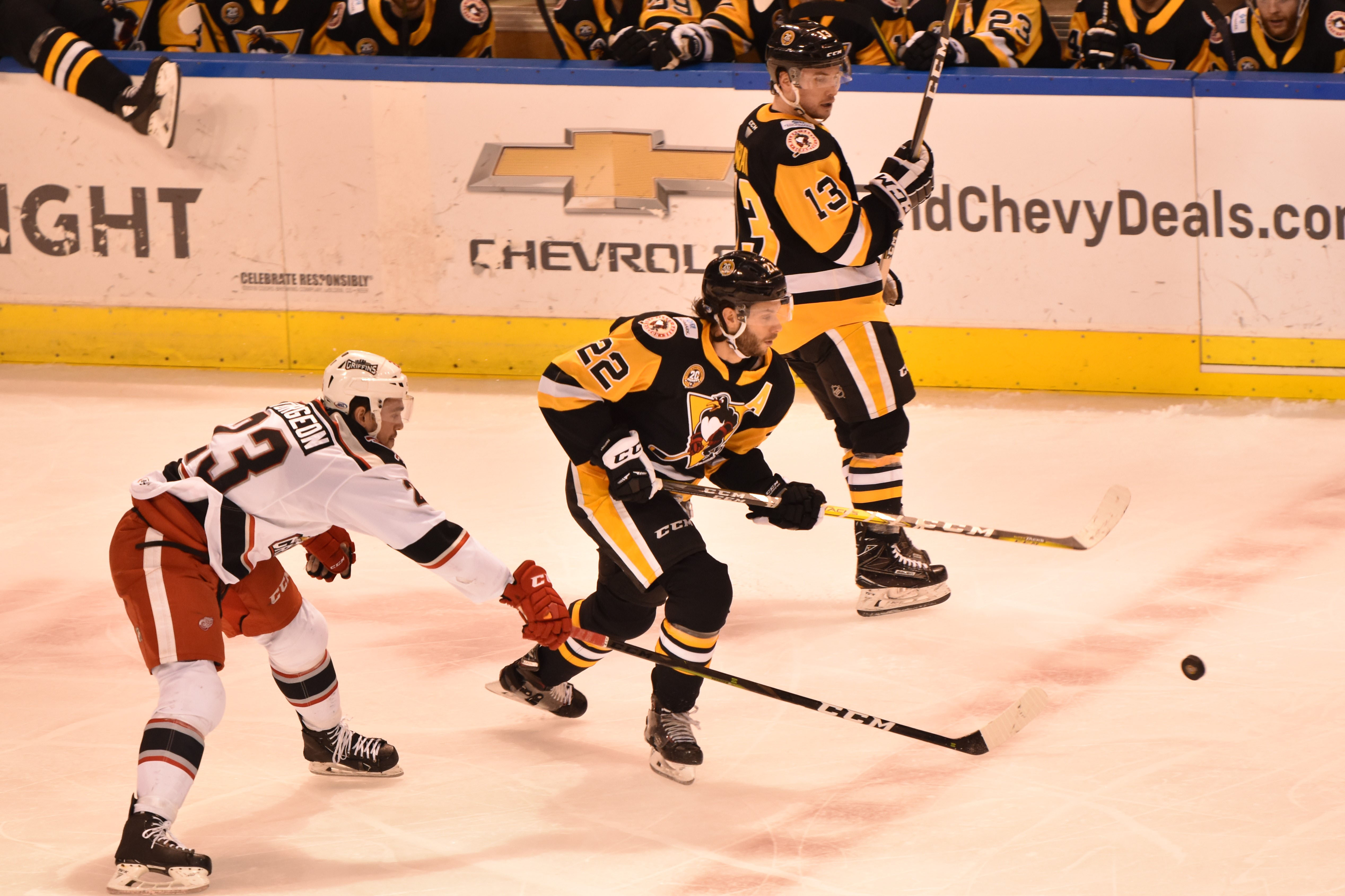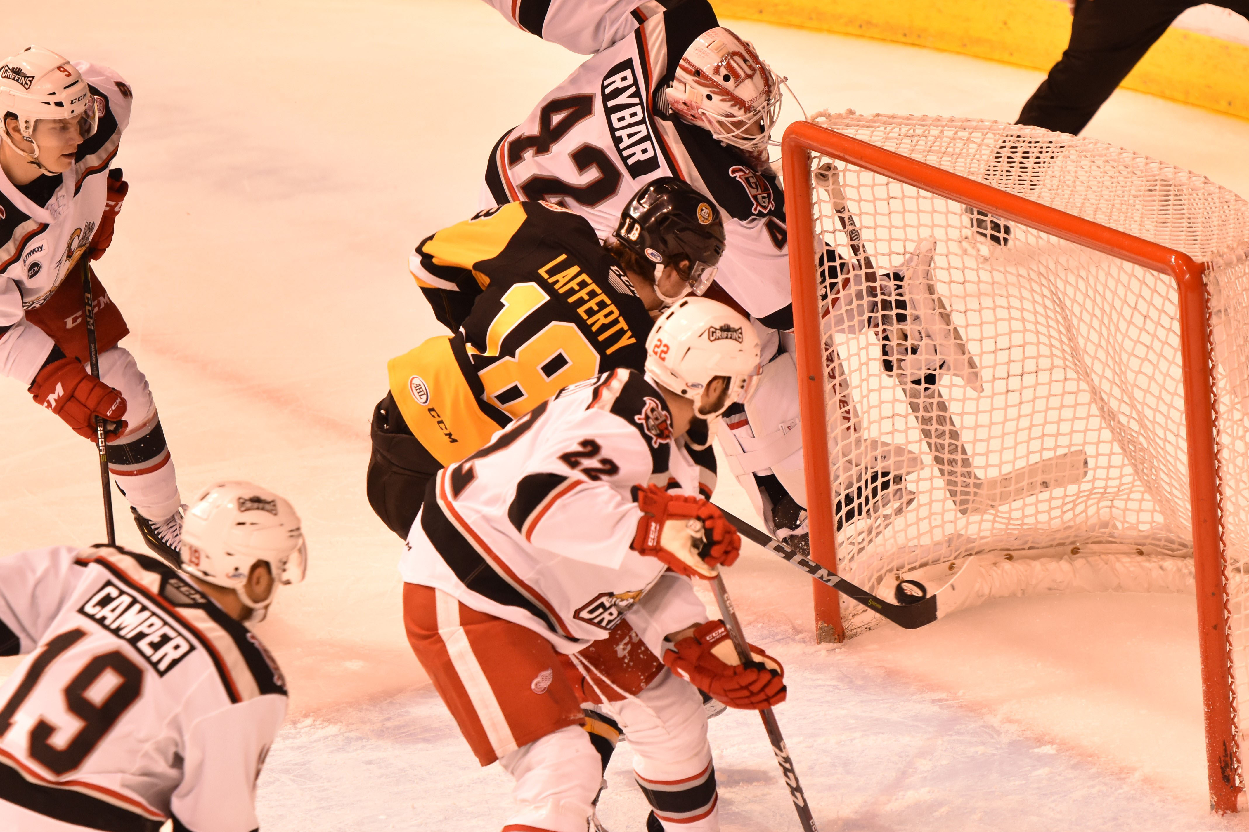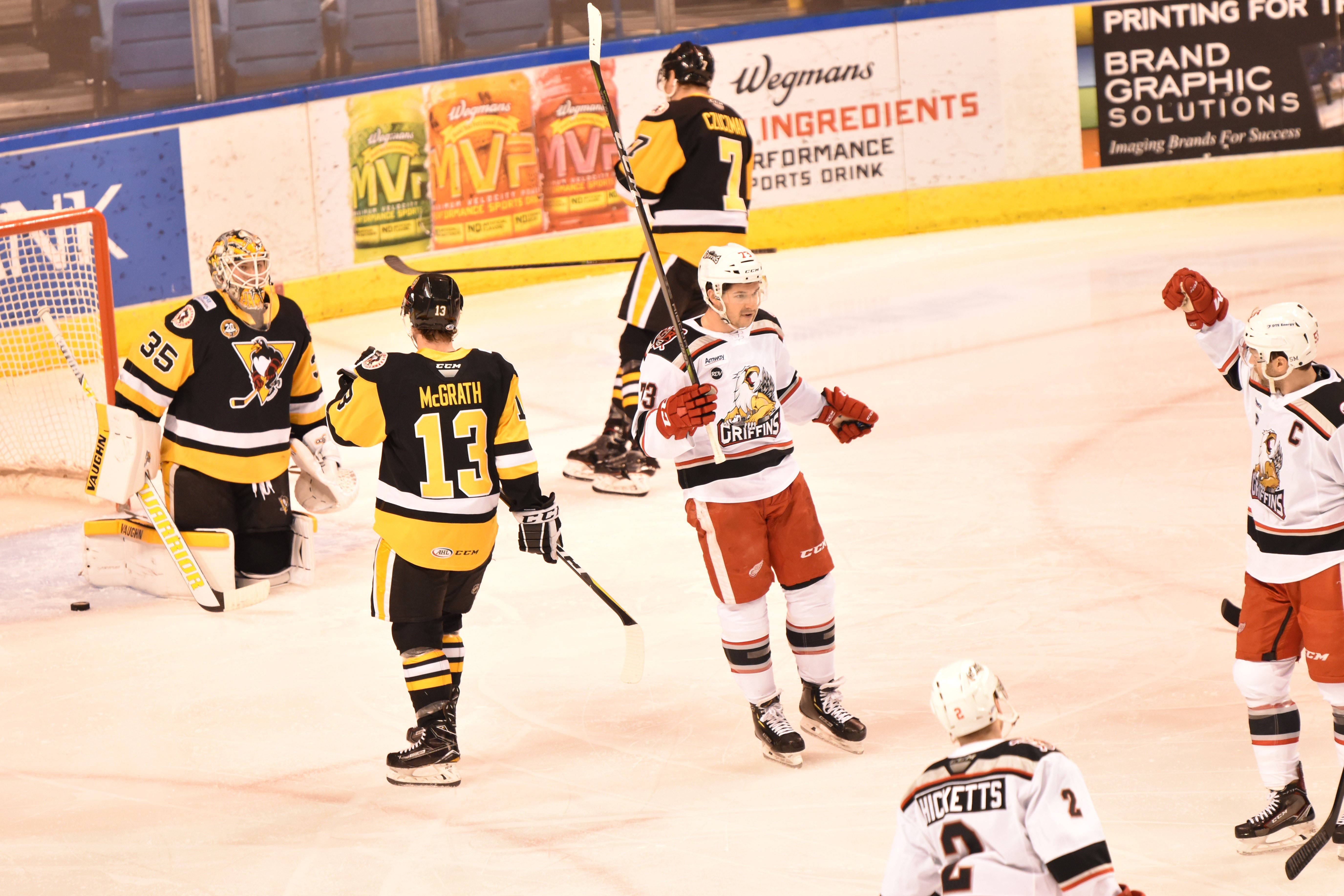 Only 17 seconds into the contest, Penguins forward Ryan Haggerty easily slipped the puck into the Griffins’ net after fishing a rebound off the pads of Grand Rapids goalie Patrik Rybár. Rybár had a hard time tracking the puck after it changed directions in the slot following a set-up at the blueline by Chad Ruhwedel and Tim Erixon.