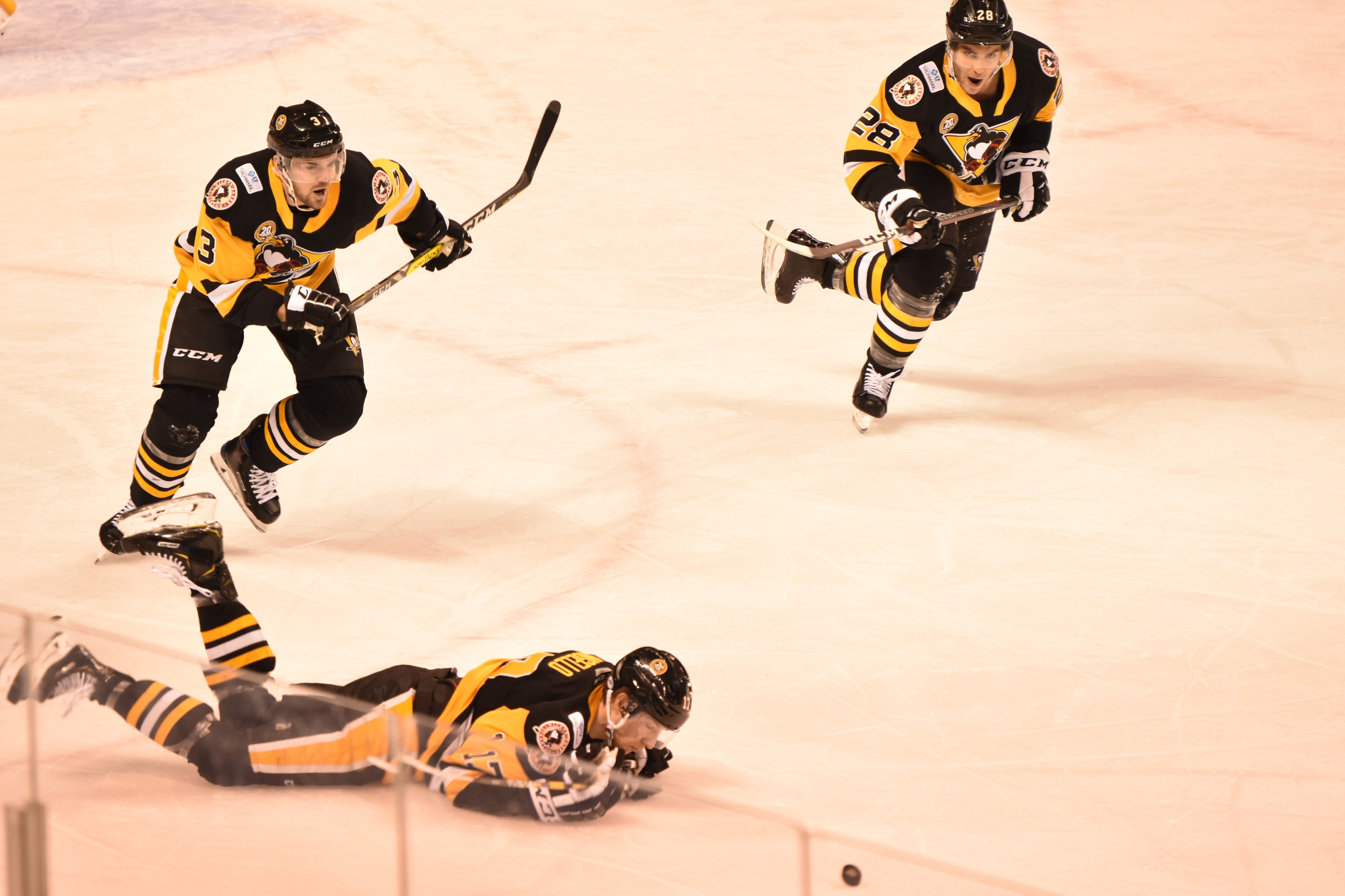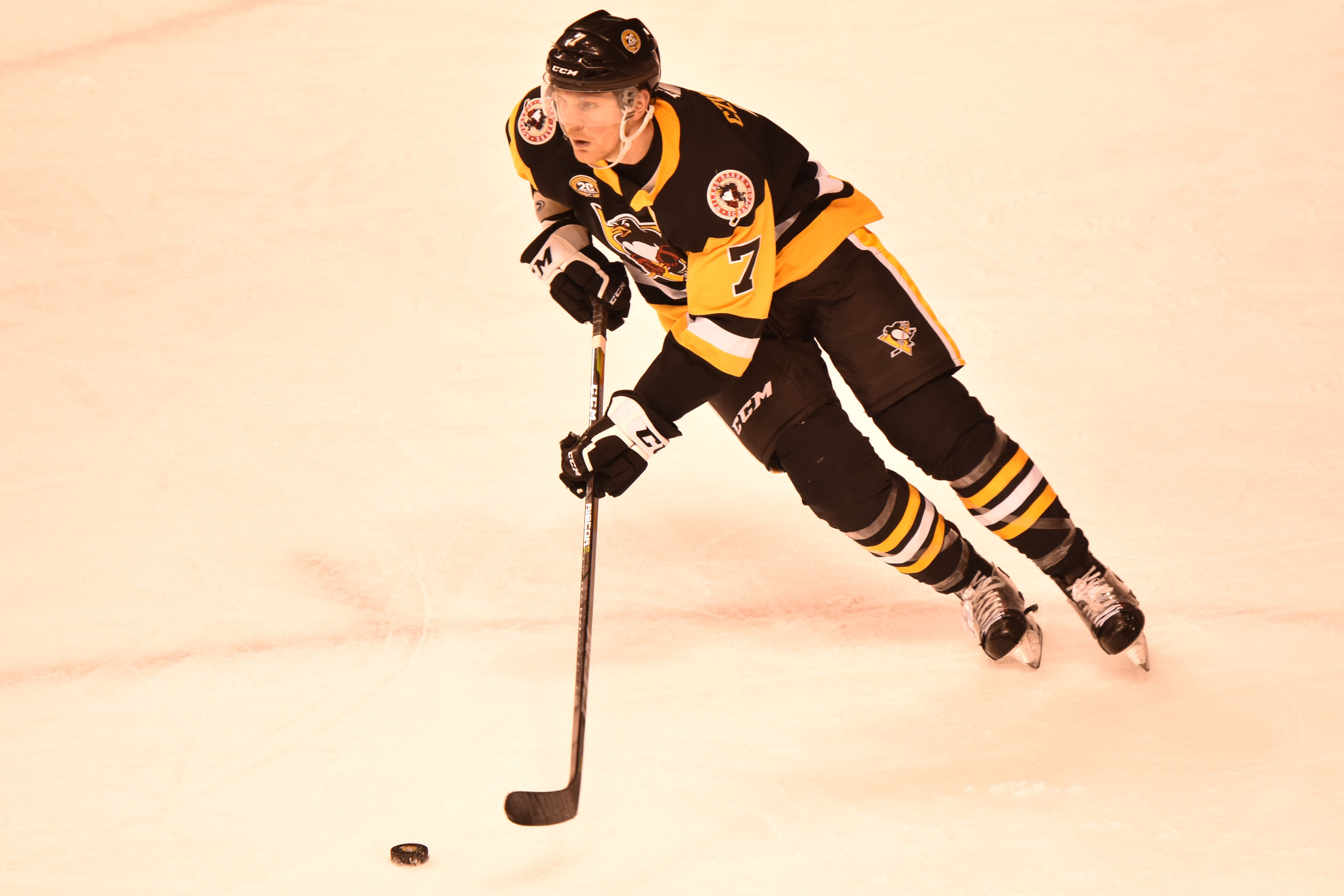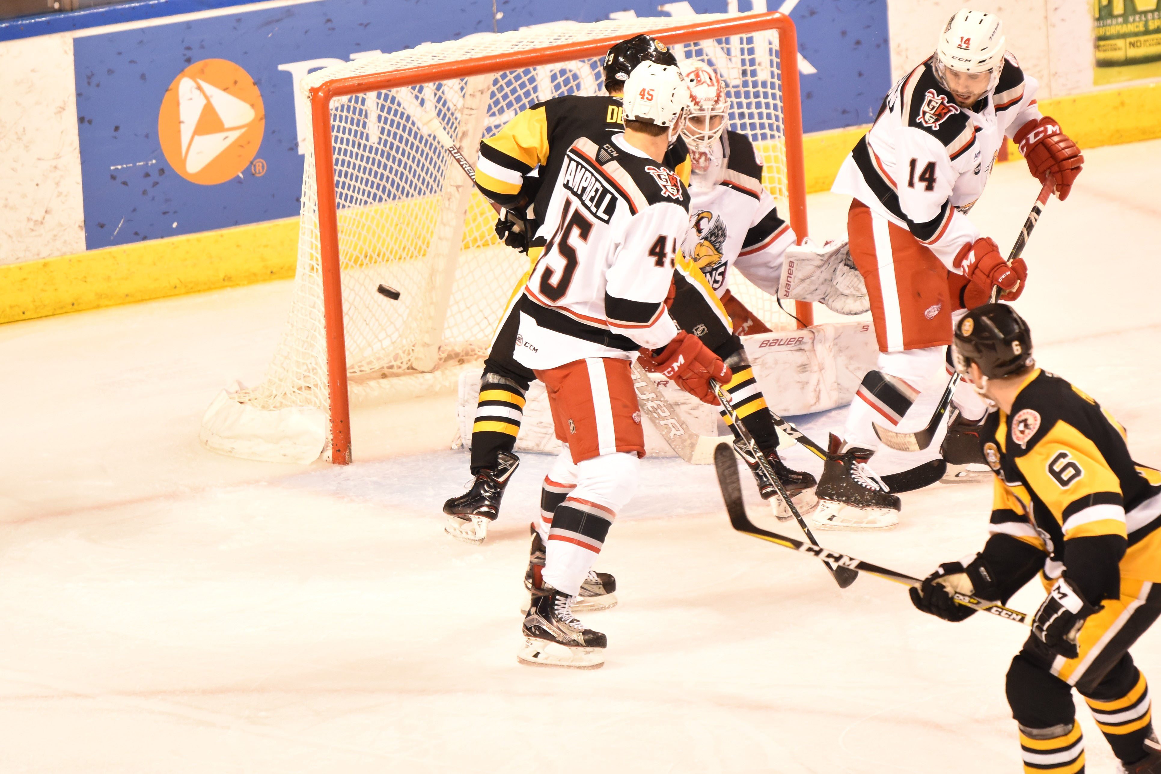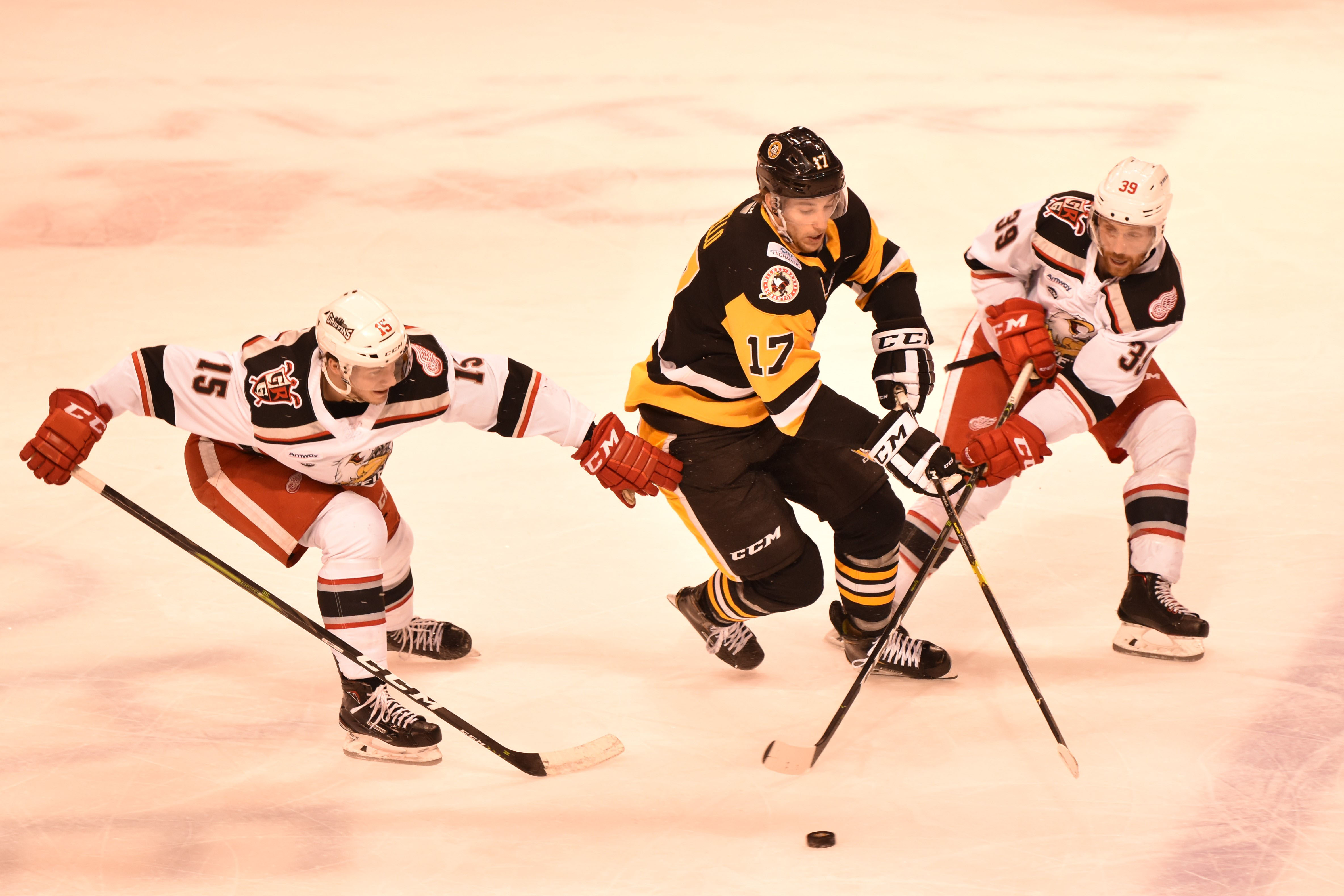 Only 17 seconds into the contest, Penguins forward Ryan Haggerty easily slipped the puck into the Griffins’ net after fishing a rebound off the pads of Grand Rapids goalie Patrik Rybár. Rybár had a hard time tracking the puck after it changed directions in the slot following a set-up at the blueline by Chad Ruhwedel and Tim Erixon.