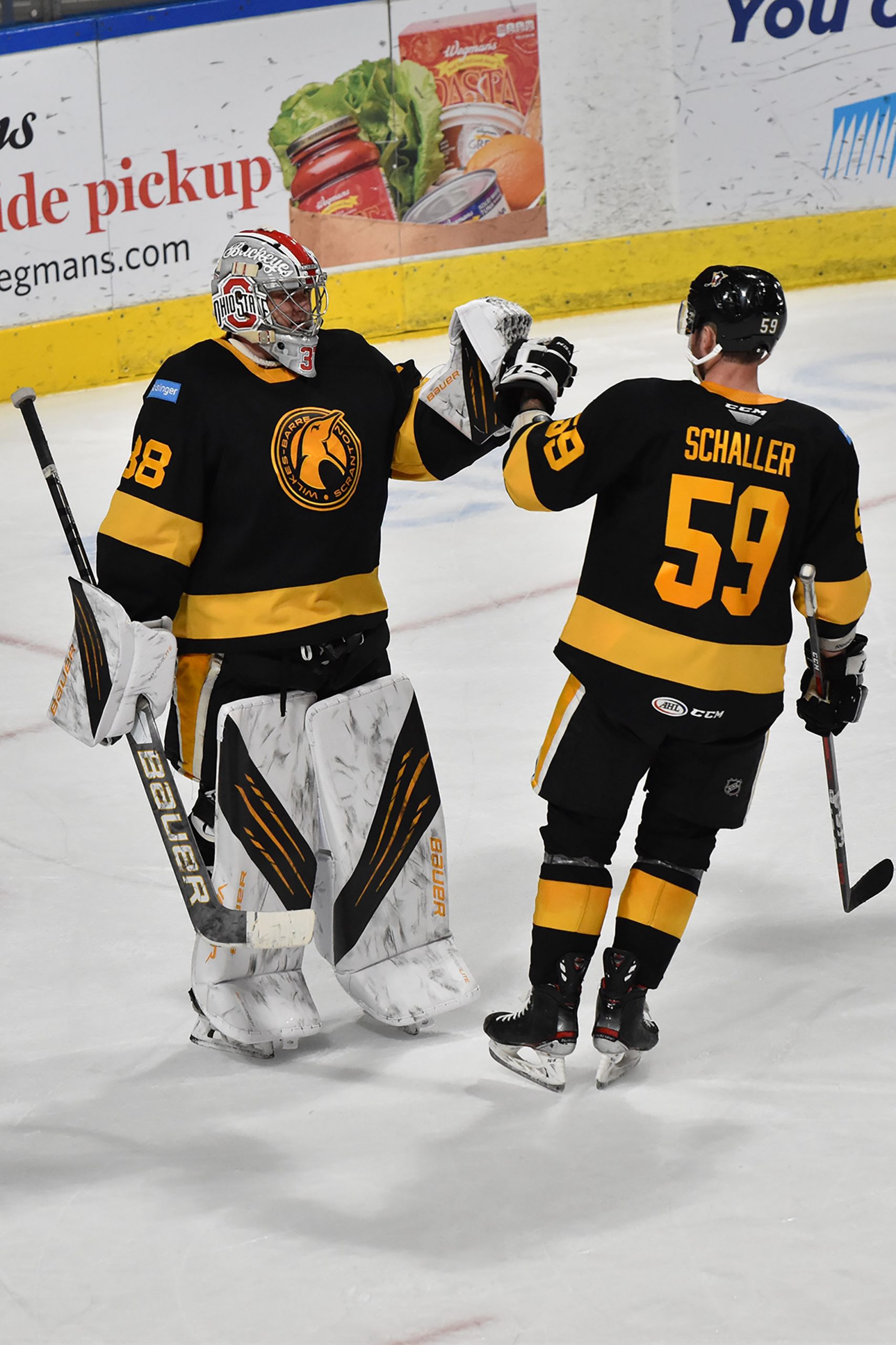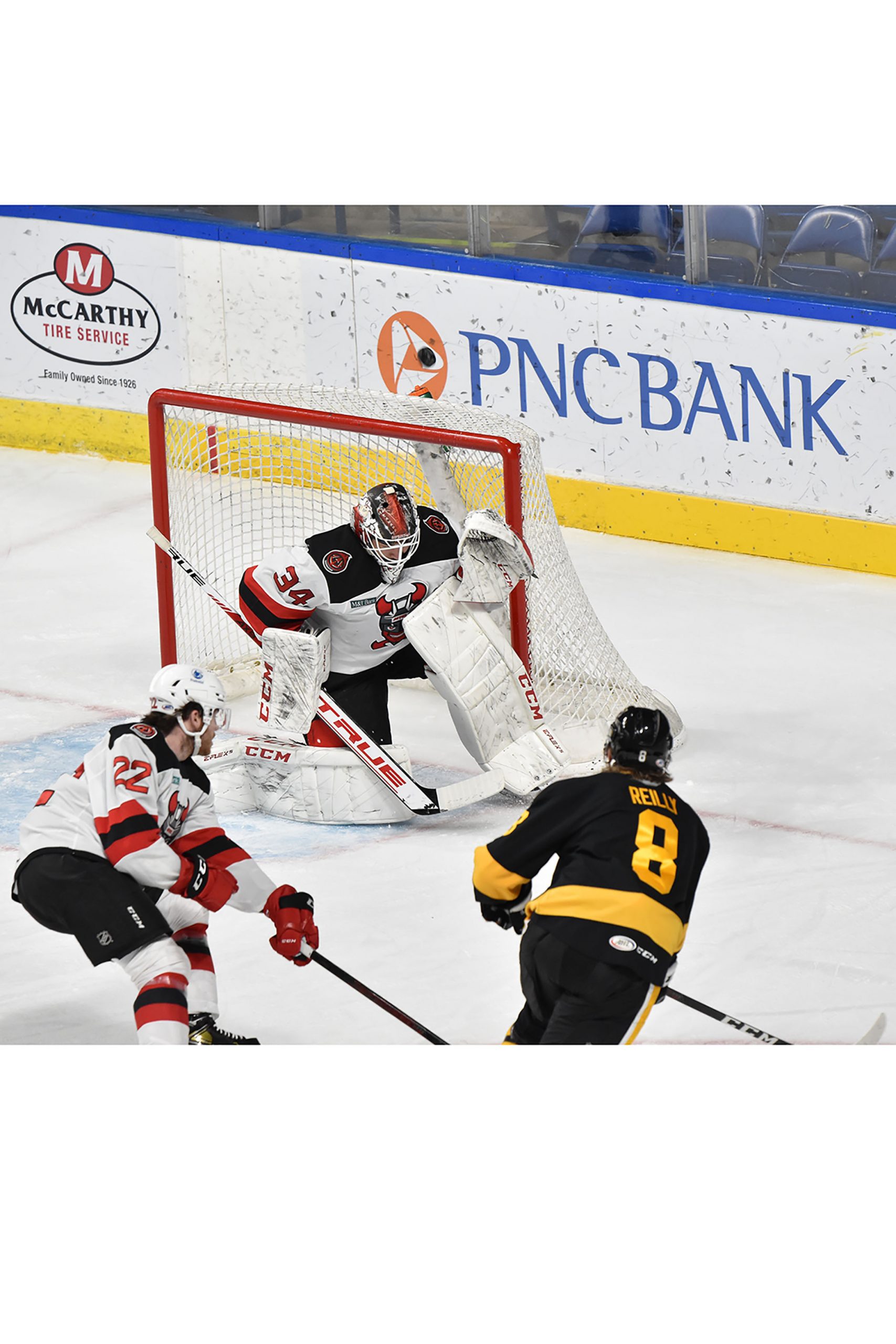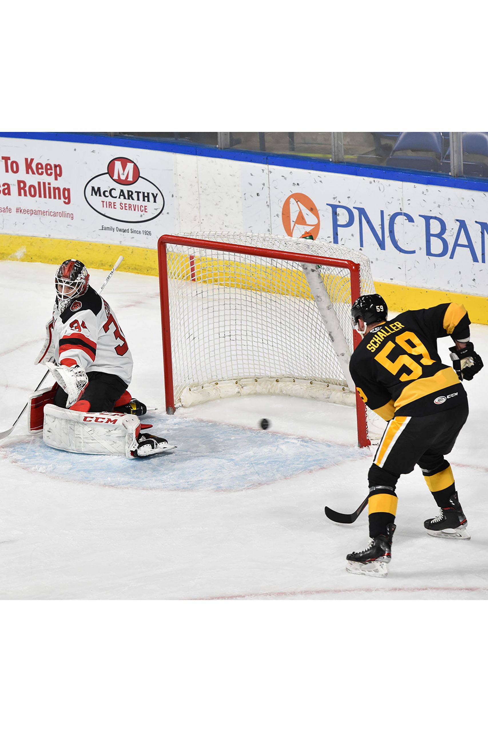 Wilkes-Barre/Scranton (12-11-4-2) ran its point streak to six games on the back of a two-goal outing from Nick Schilkey and a “Gordie Howe Hat Trick” by rookie Jonathan Gruden. Another rookie, goaltender Tommy Nappier, played a key role in the victory as well, stopping 22 shots for his first win as a pro.