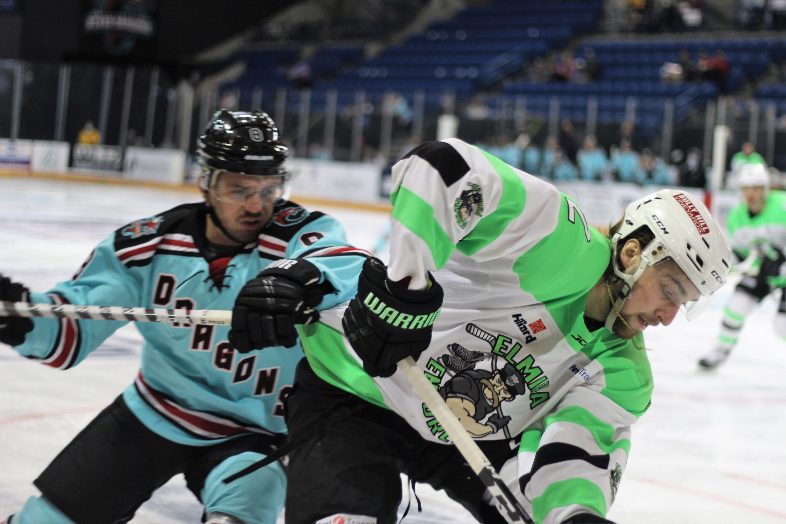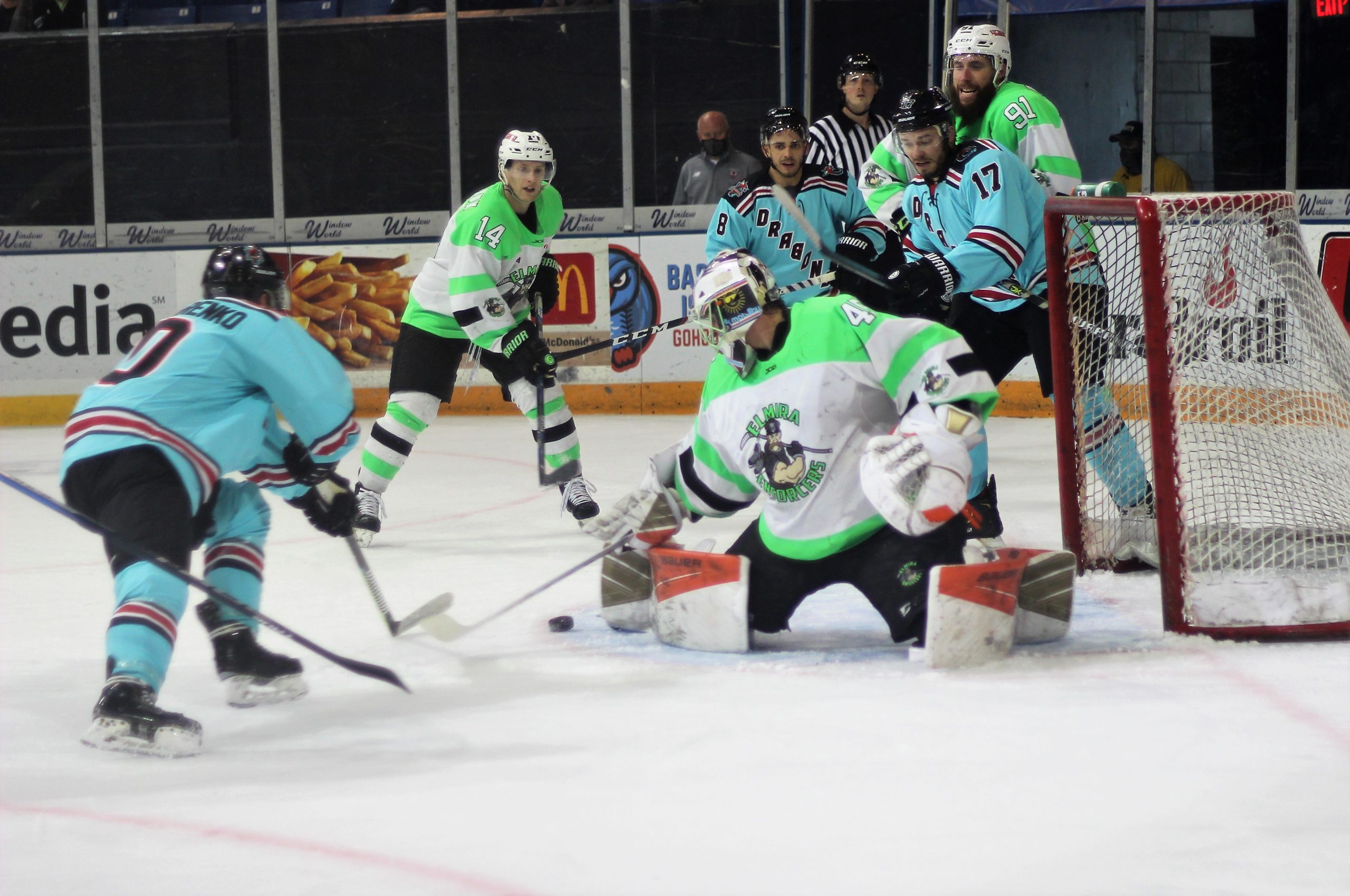 Brett Gravelle tied the game up at the 13:43 mark of the first period with a weird pinball bounce off of skates and the post to get his 6th of the season. Less than two minutes later, Blake Peavey found the back of the net to give Elmira a 2-1 lead over the Dragons going into the locker room.