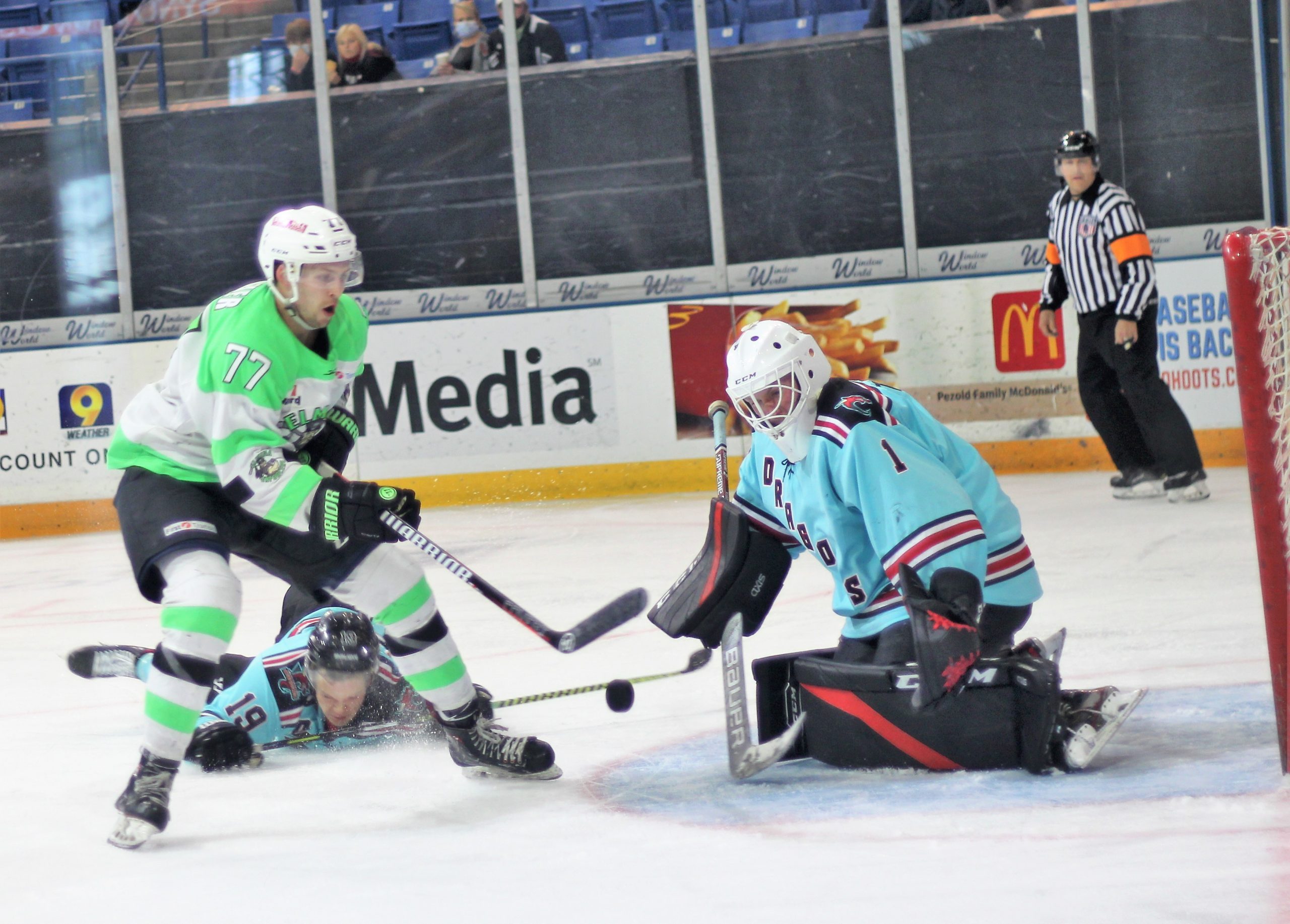 Jared Rutledge got the overtime win for the Dragons, he stopped 27 of 31 shots in the contest. Dillon Kelley takes the overtime loss (his 3rd of the season) and made 43 saves on 48 River Dragons shots.