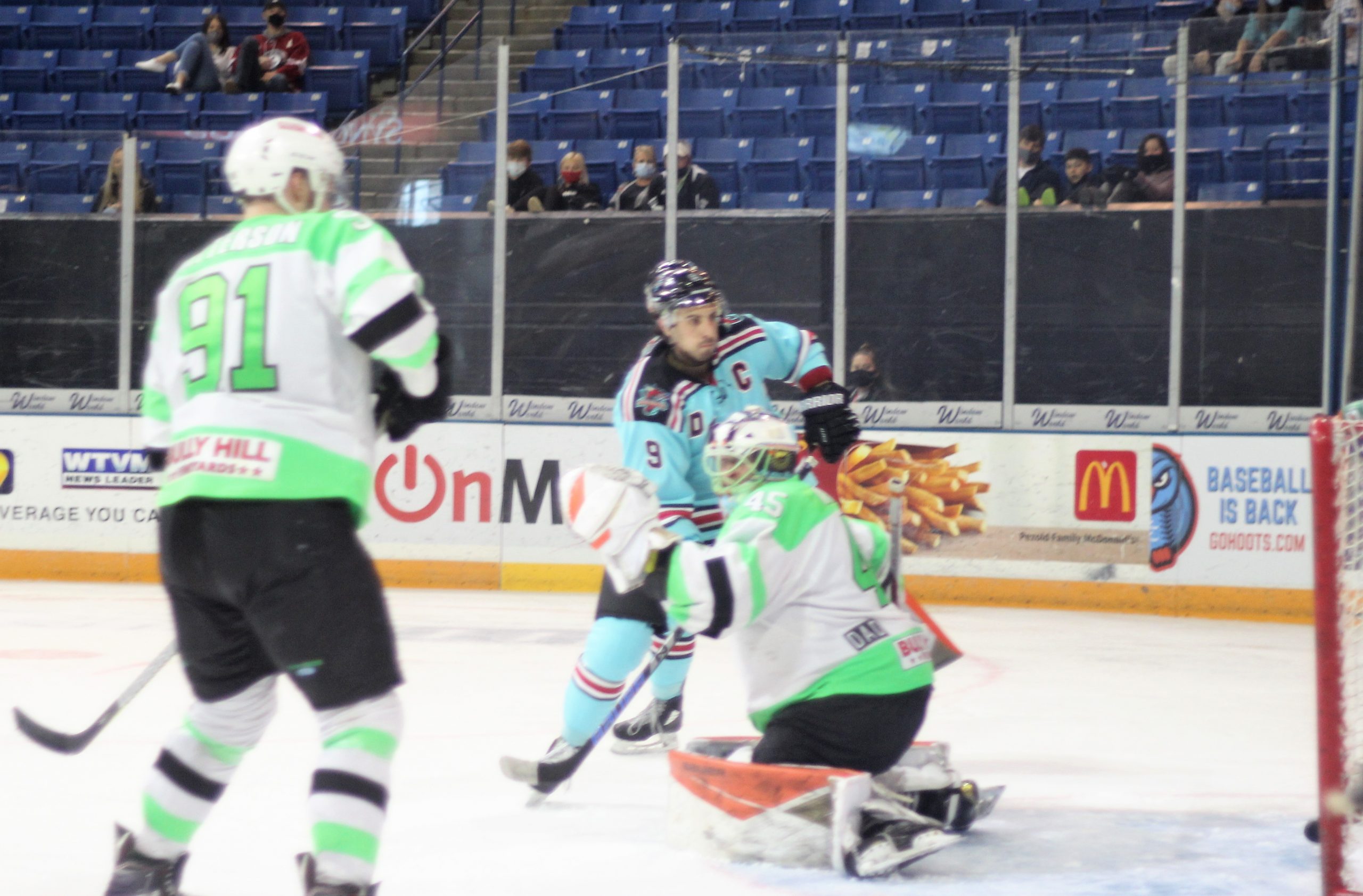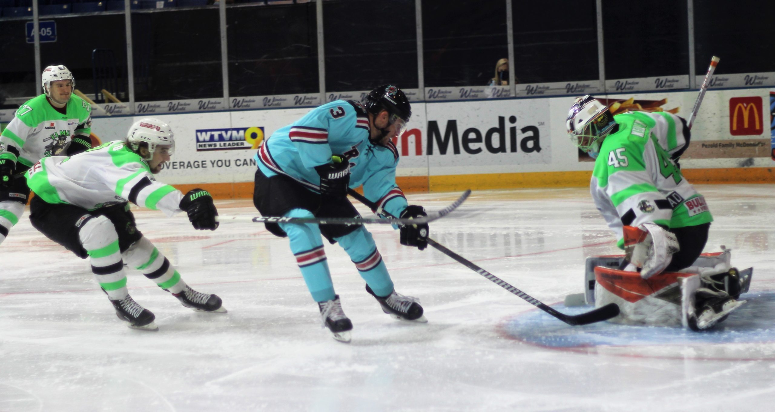 Elmira was in control in the first two periods of the game but it was Columbus who got on the board first when Gehrett Sargis sniped the top-left corner over Dillon Kelley at the 8:13 mark of the first. After that though, Elmira scored four straight through the first and second periods and continued to dictate the pace of play.