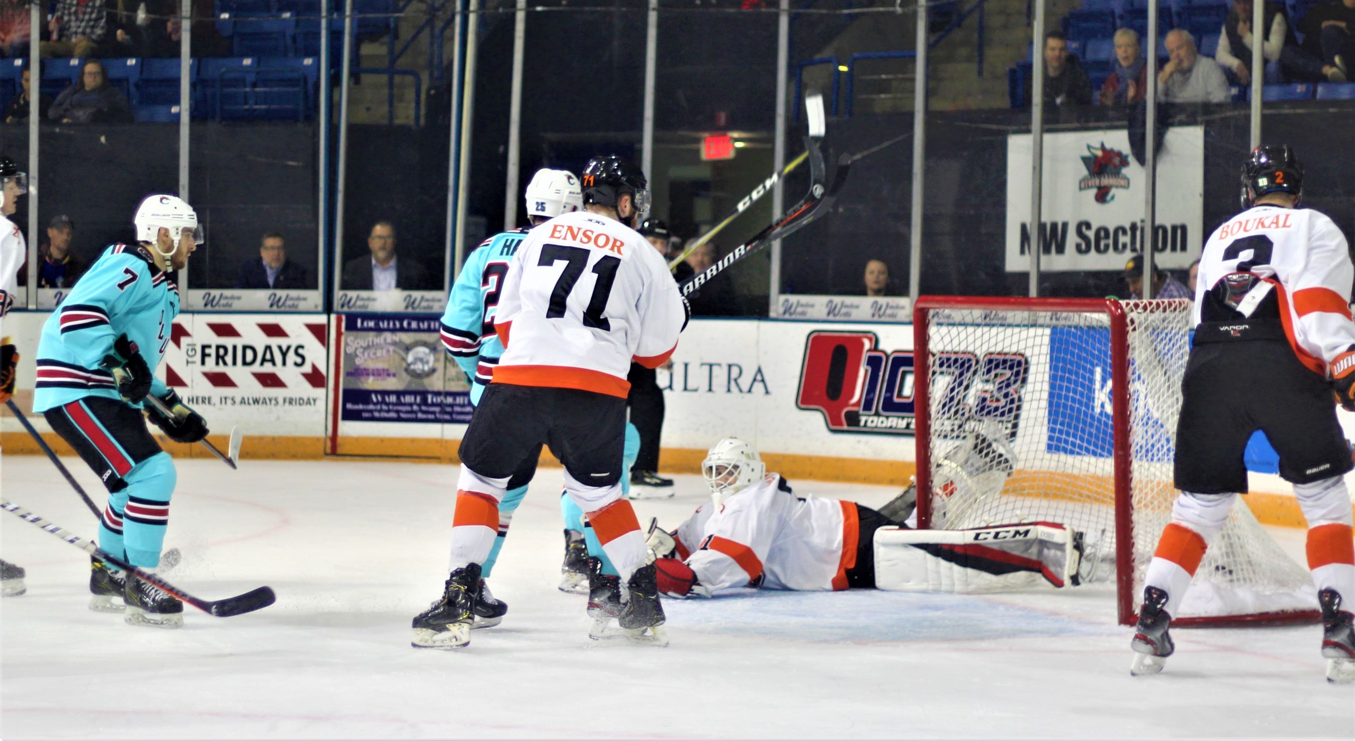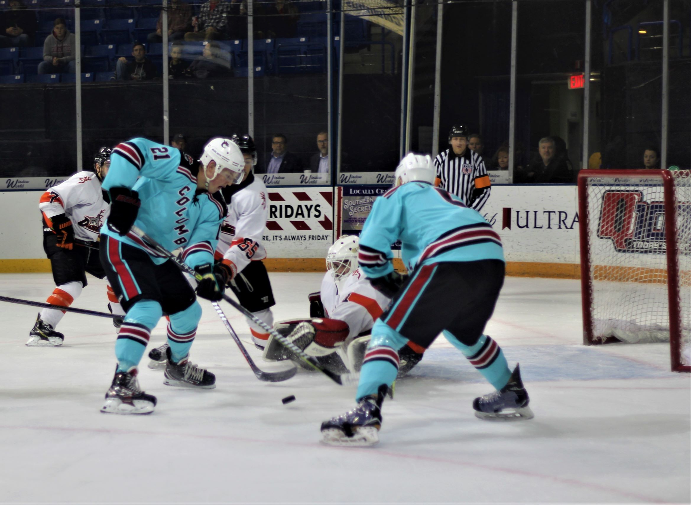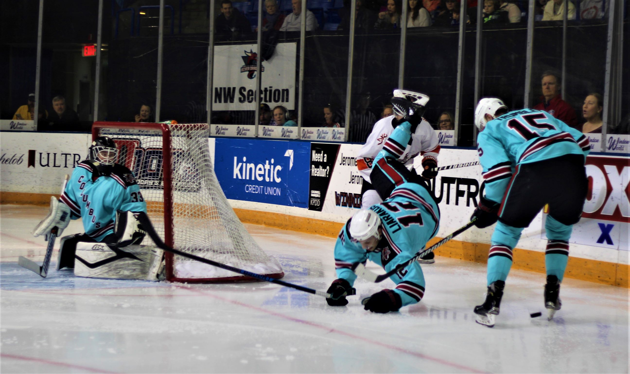 Columbus struck first via the power play when Wyatt Trumbley potted in his fourth of the season after a great passing sequence from Davide Asselin and CJ Hayes. For Hayes the assist gave his a 10-game point streak. He would follow that up with a goal being in the right place at the right time after the puck pinballed around the slot and he slipped it past Gordichuk for a 2-0 lead. That tally gave Hayes a goal in nine consecutive games.