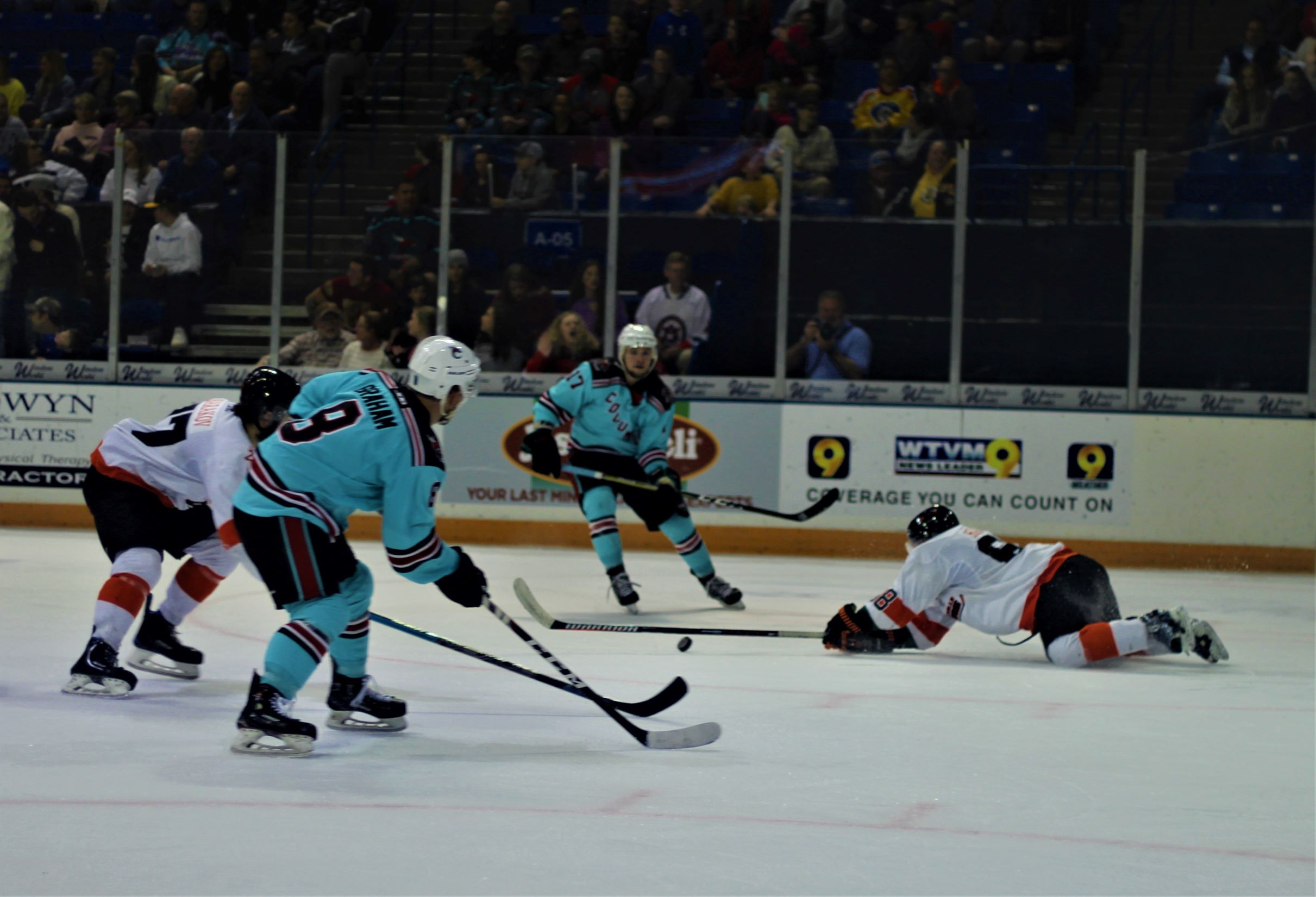 Then the third period saw that competitive game turn into a landslide by way of the River Dragons. Three goals in the first 4:14 of the third period courtesy of Hayes, Parker Moskal and Ivan Bondarenko made it 5-1 before some of the crowd of 3,326 could make it back to their seats to start the third.