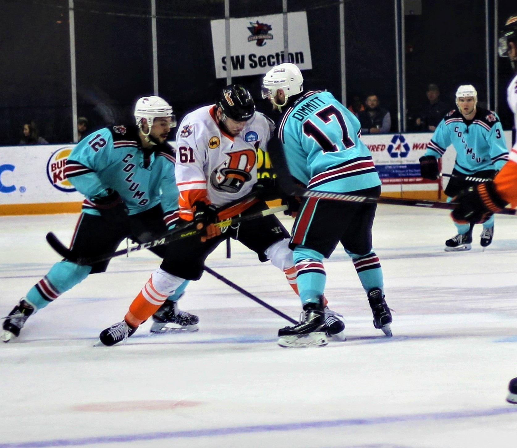Columbus, GA – The win, the weekend and the season series went to Columbus River Dragons on Sunday afternoon after a 5-3 win over the Danbury Hat Tricks at the Civic Center.