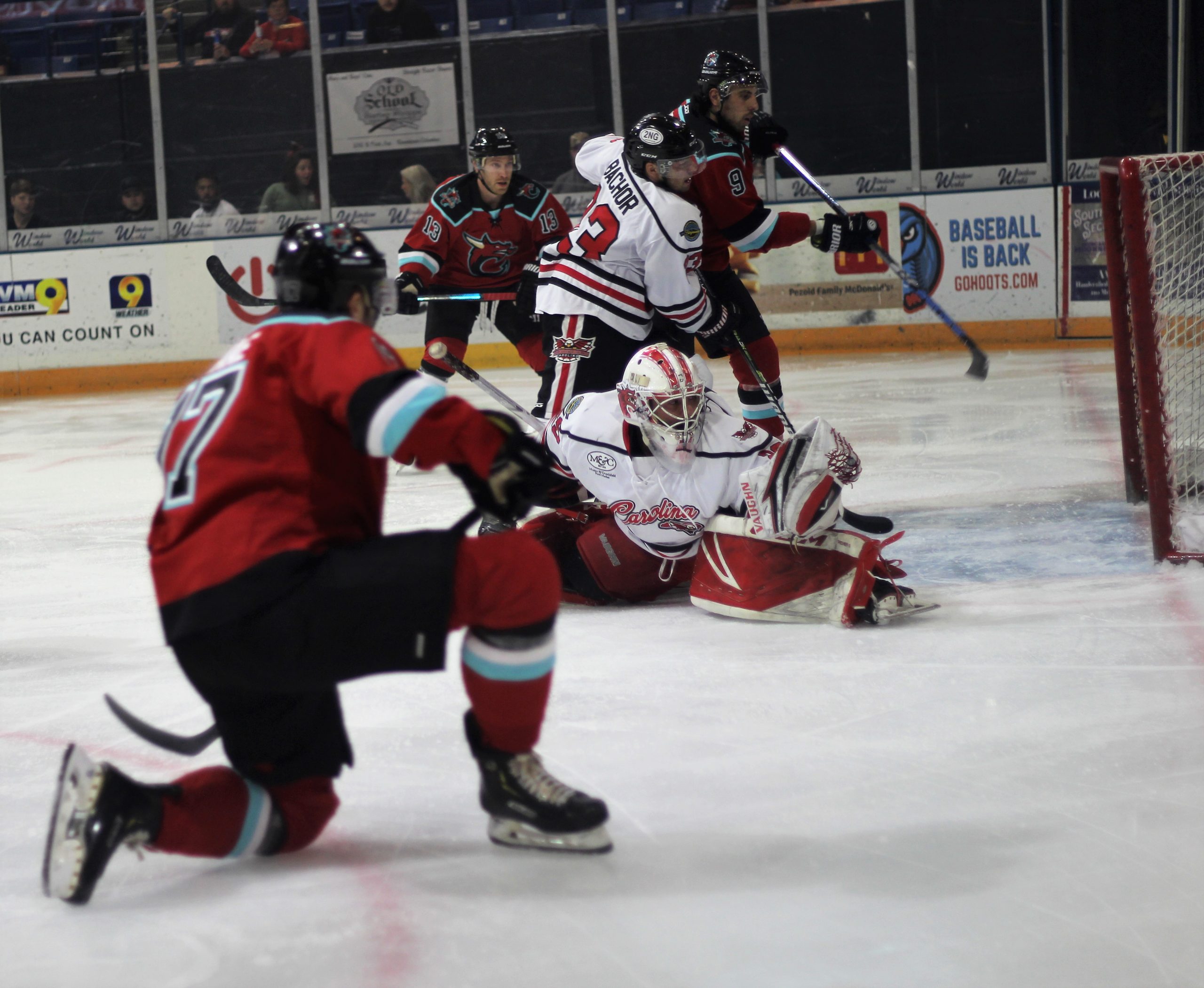 With a 3-0 lead heading into the locker room, Carolina started to battle back and found the back of the net when Jiri Pestuka was left open in front of Rutledge for a 3-1 game 5:55 into the second period.