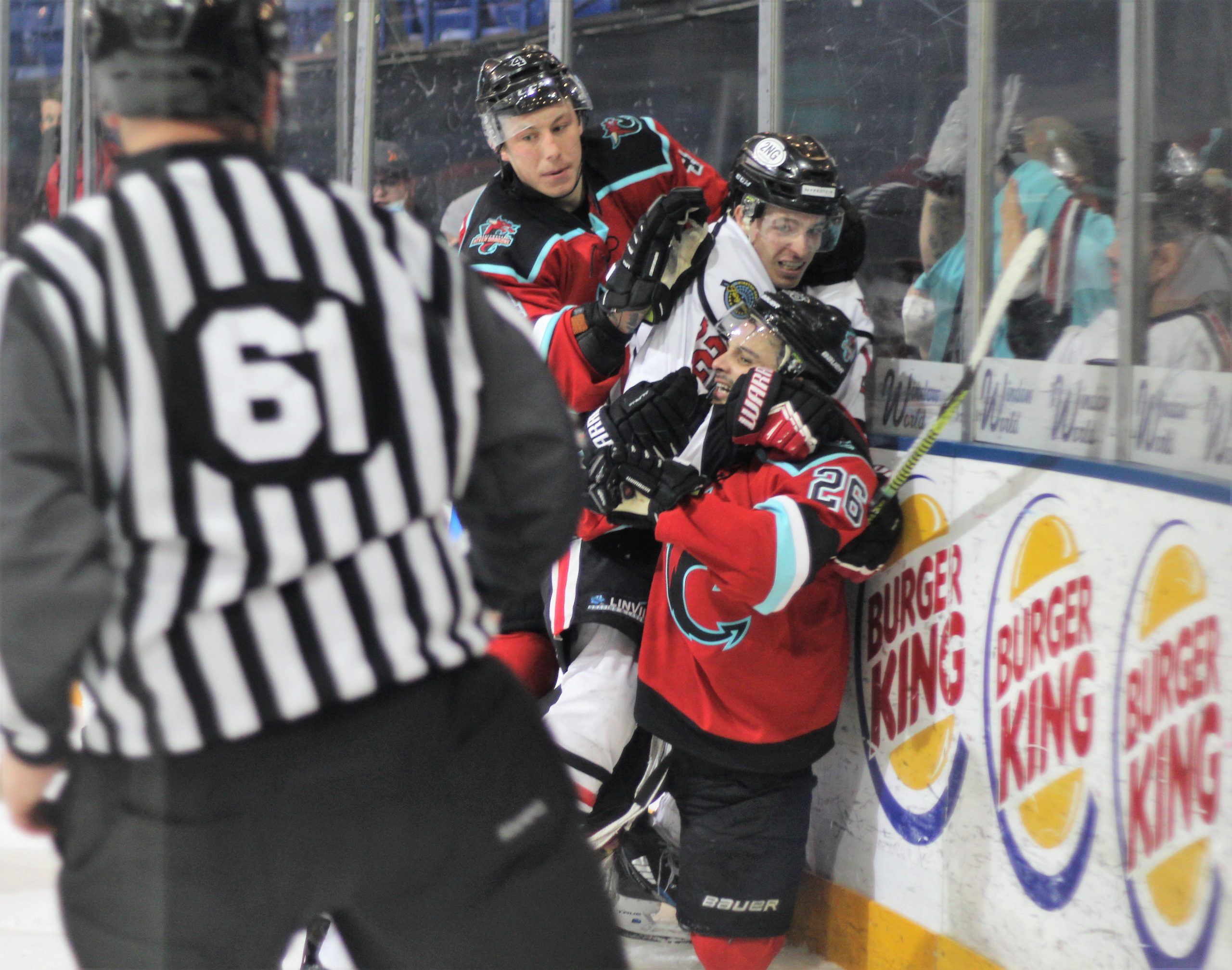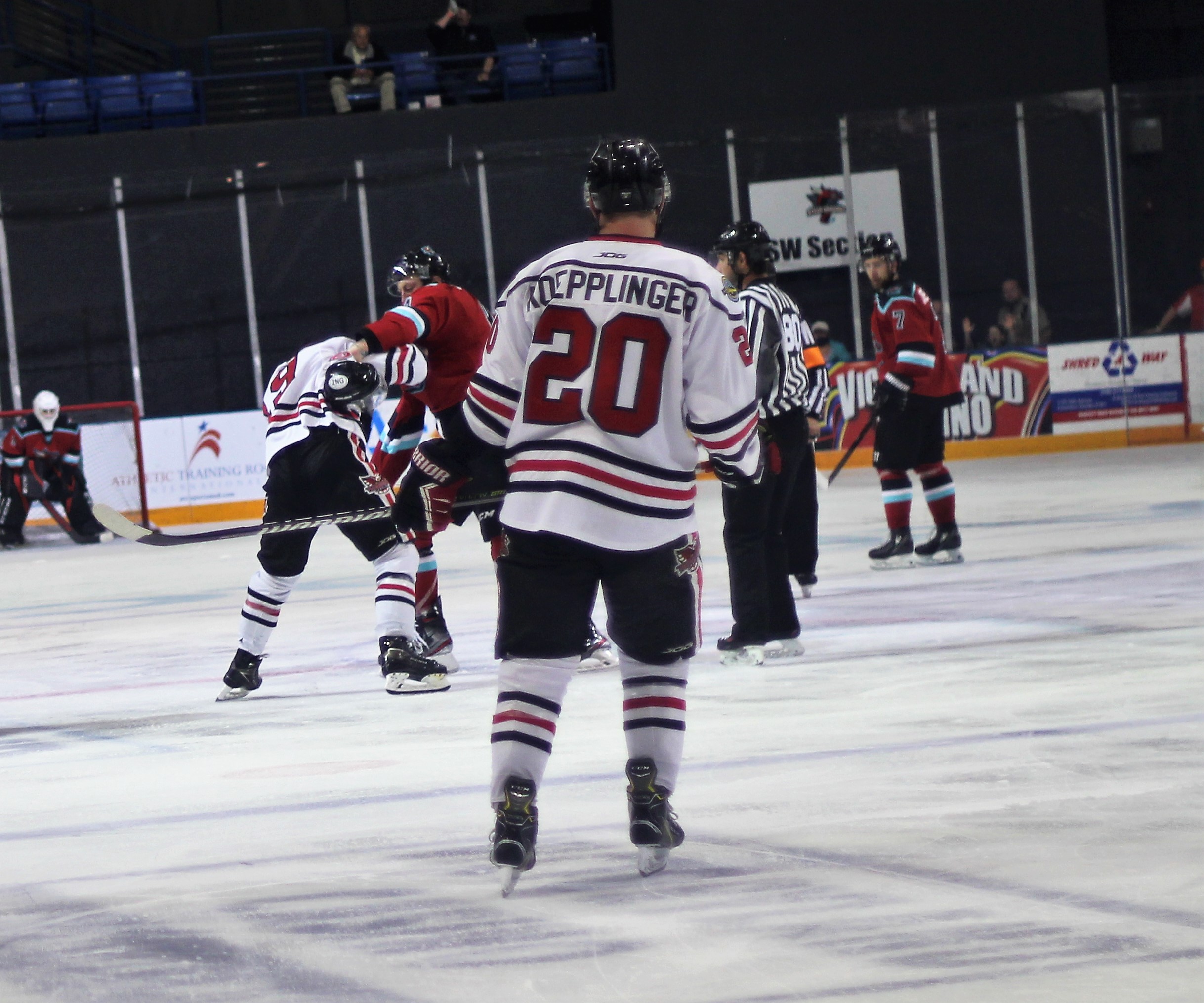 A fight broke out at the 6:09 mark of the 3rd period after a Jake Schultz hit on Jan Salak saw the big Czech lose his helmet and Fred Hein challenged Schultz to drop gloves which the big man was not afraid to. The resulting fisticuffs kept the crowd fired up as the game began to dwindle down.