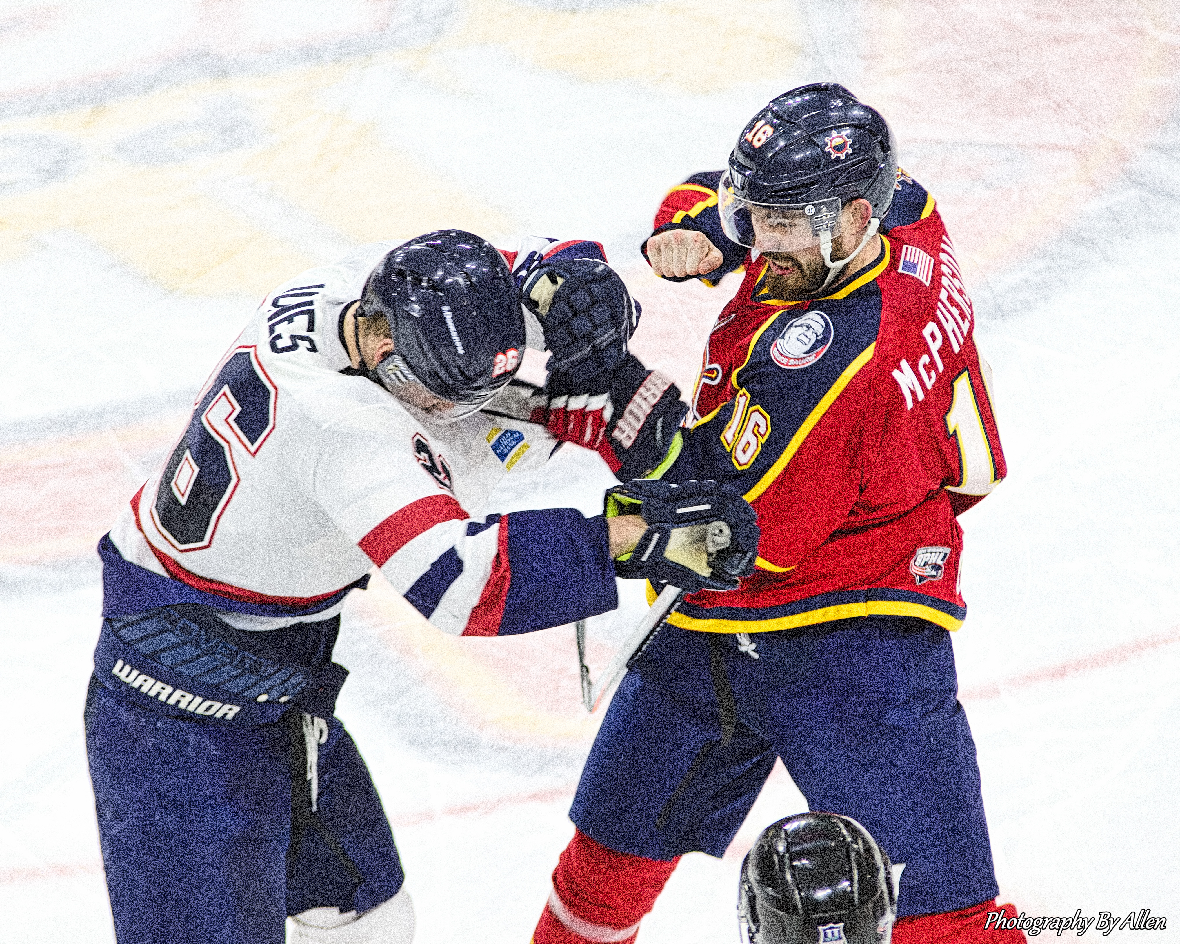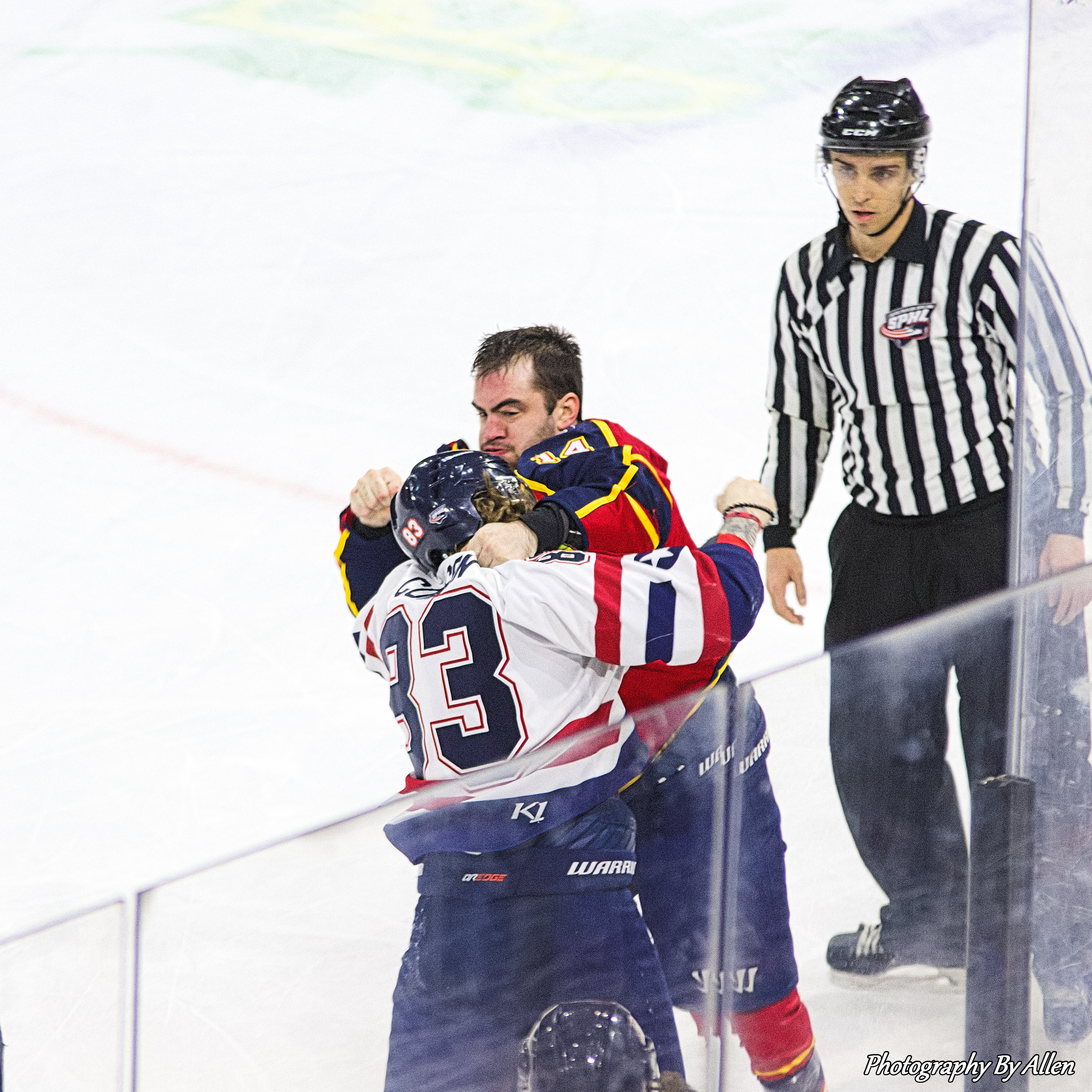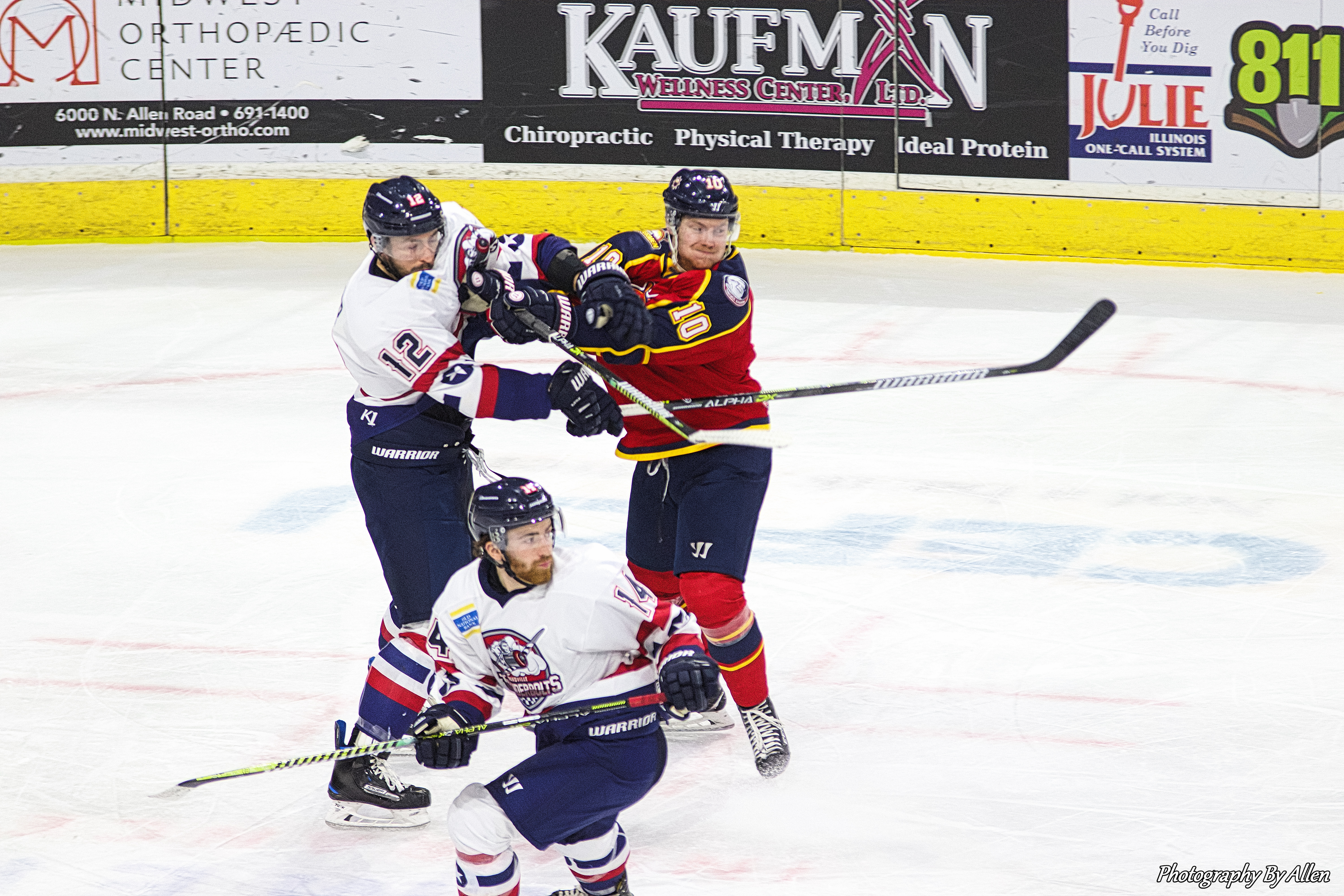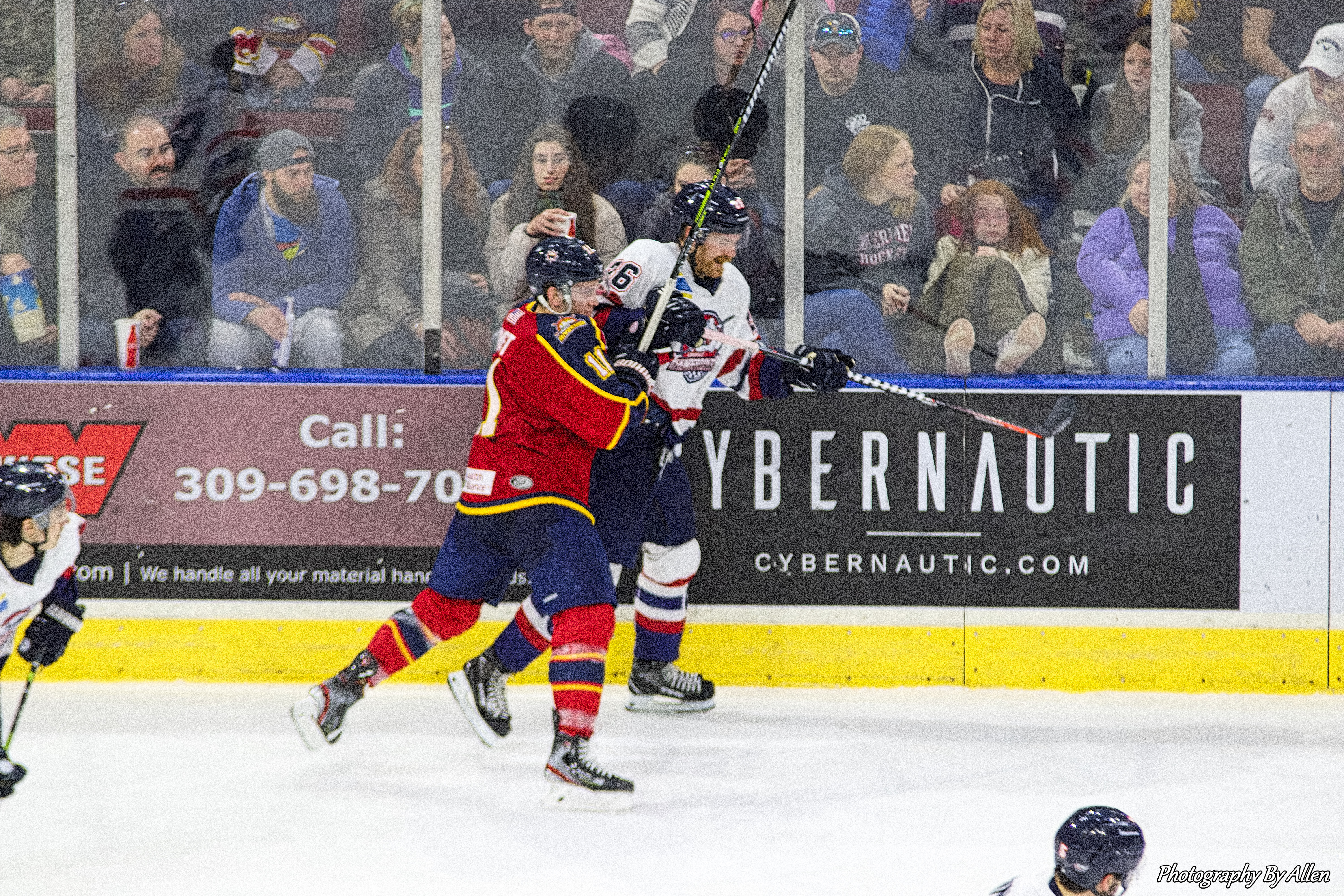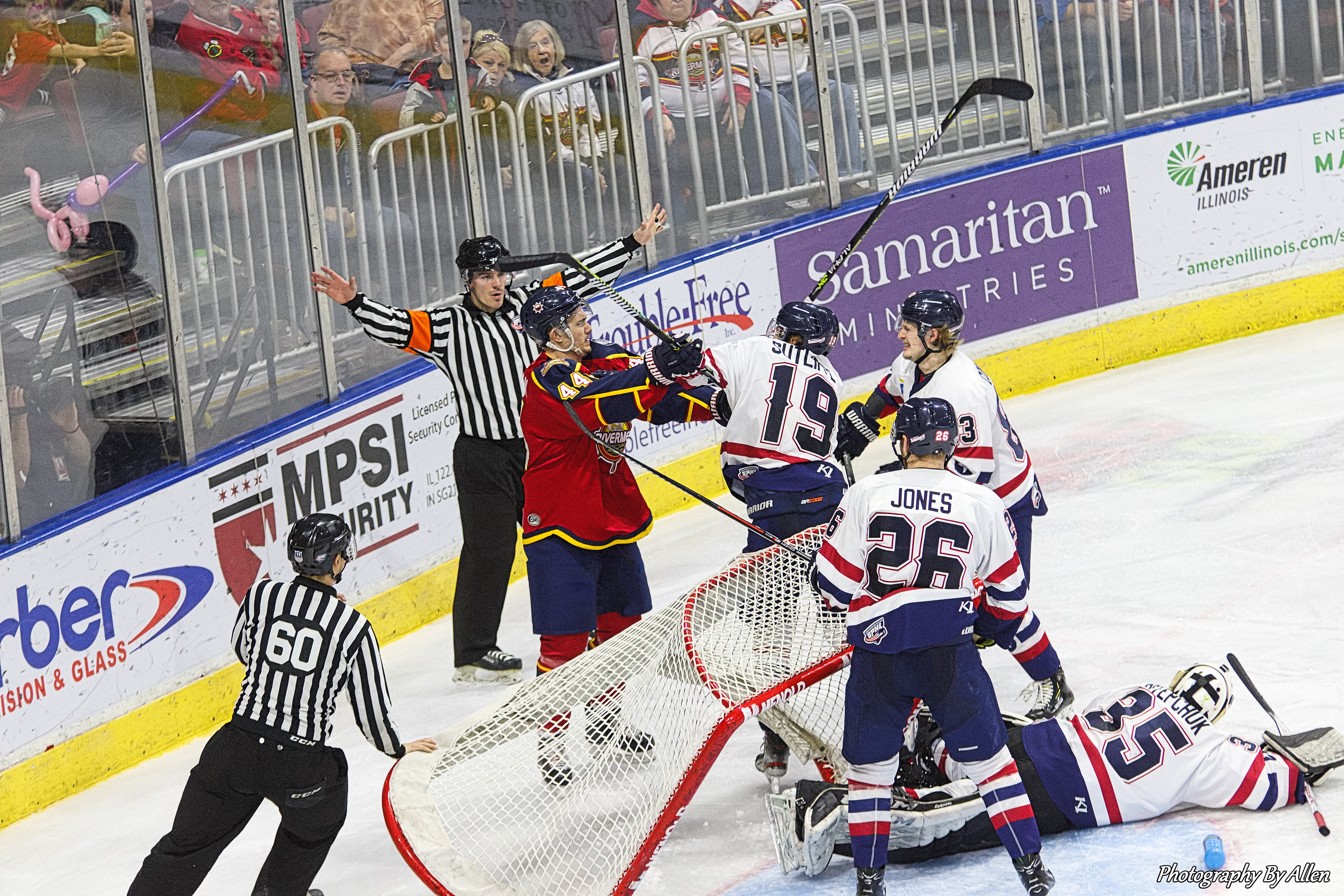 At the 6:26 mark of the first, chaos ensued down at ice level. Taking exception to a boarding play from Stanislav Dzakhov on Jordan Carvalho, Rivermen captain Alec Hagaman initiated a fight with the Evansville forward. Moments later before the next faceoff, Ben Oskroba would trade punches with Braedyn Asselstine, meaning both players would be ejected on account of the second fight after a whistle.