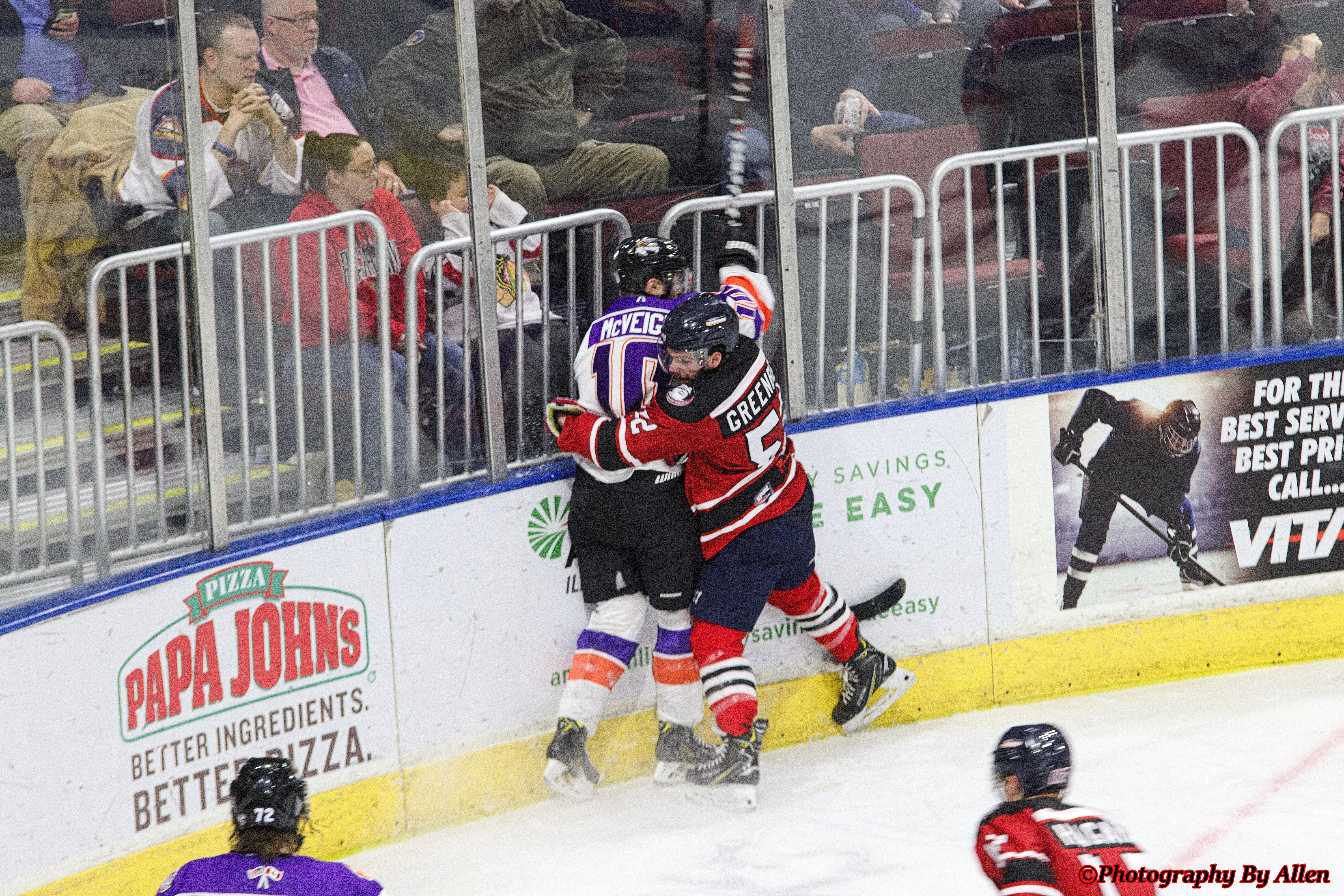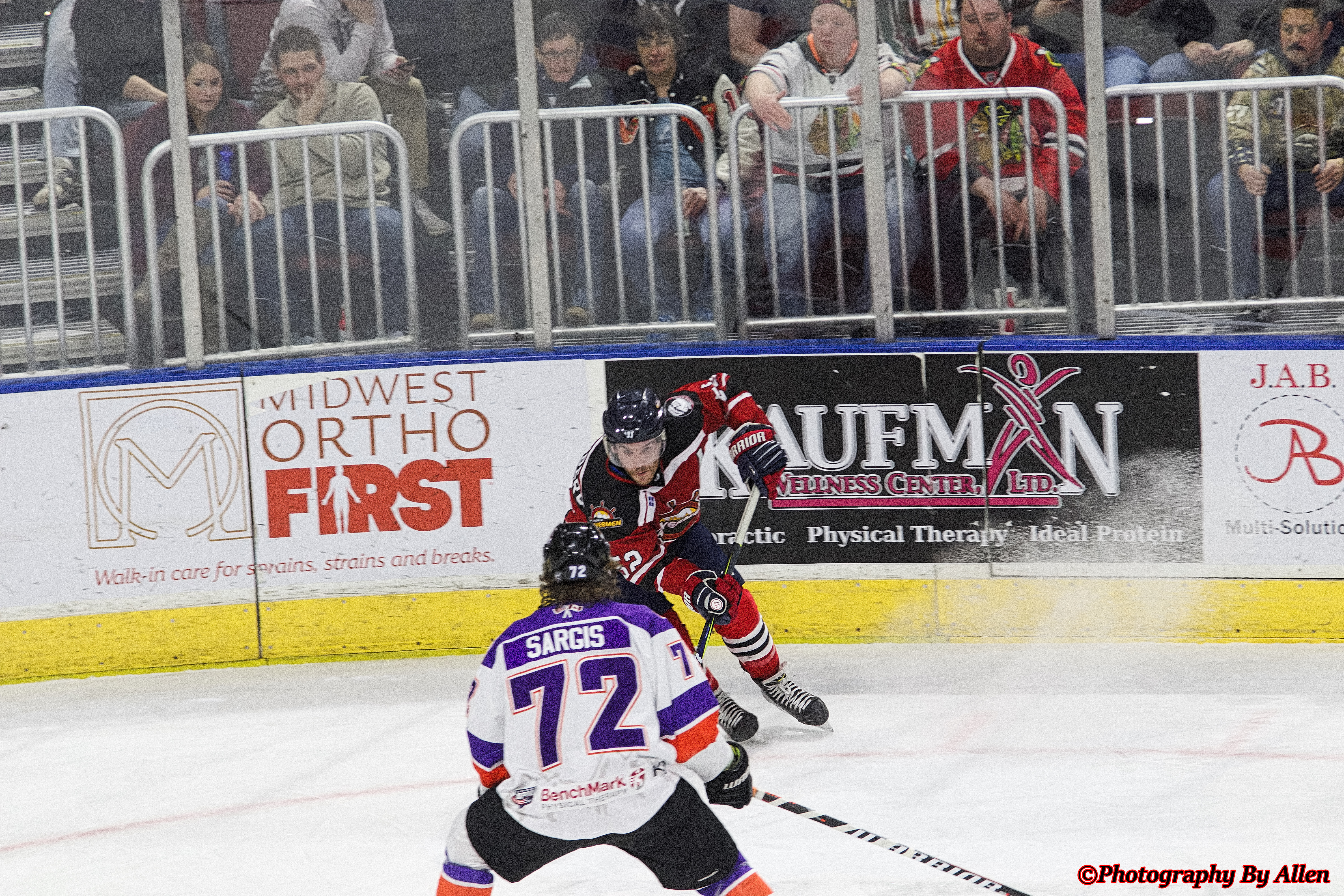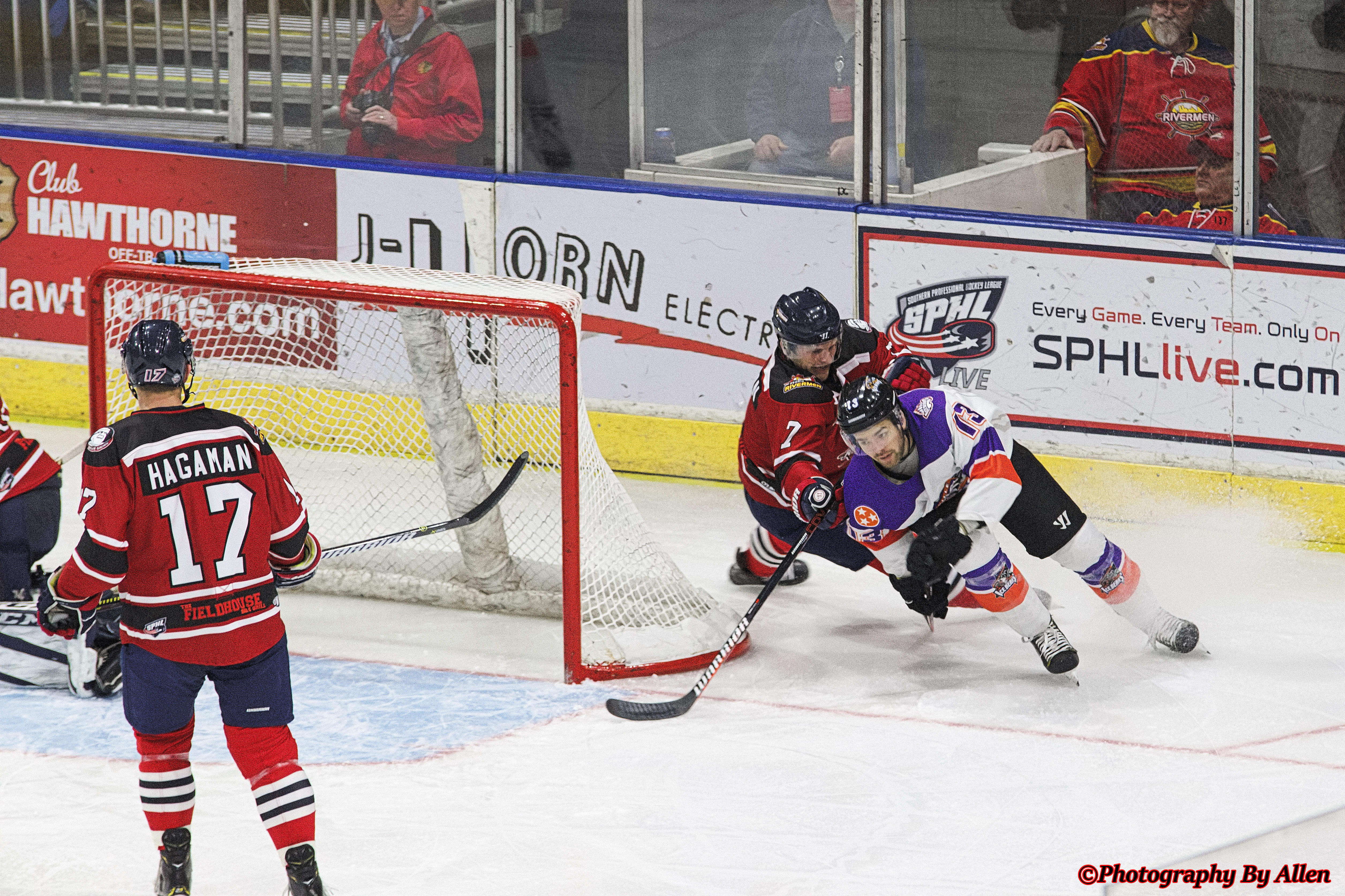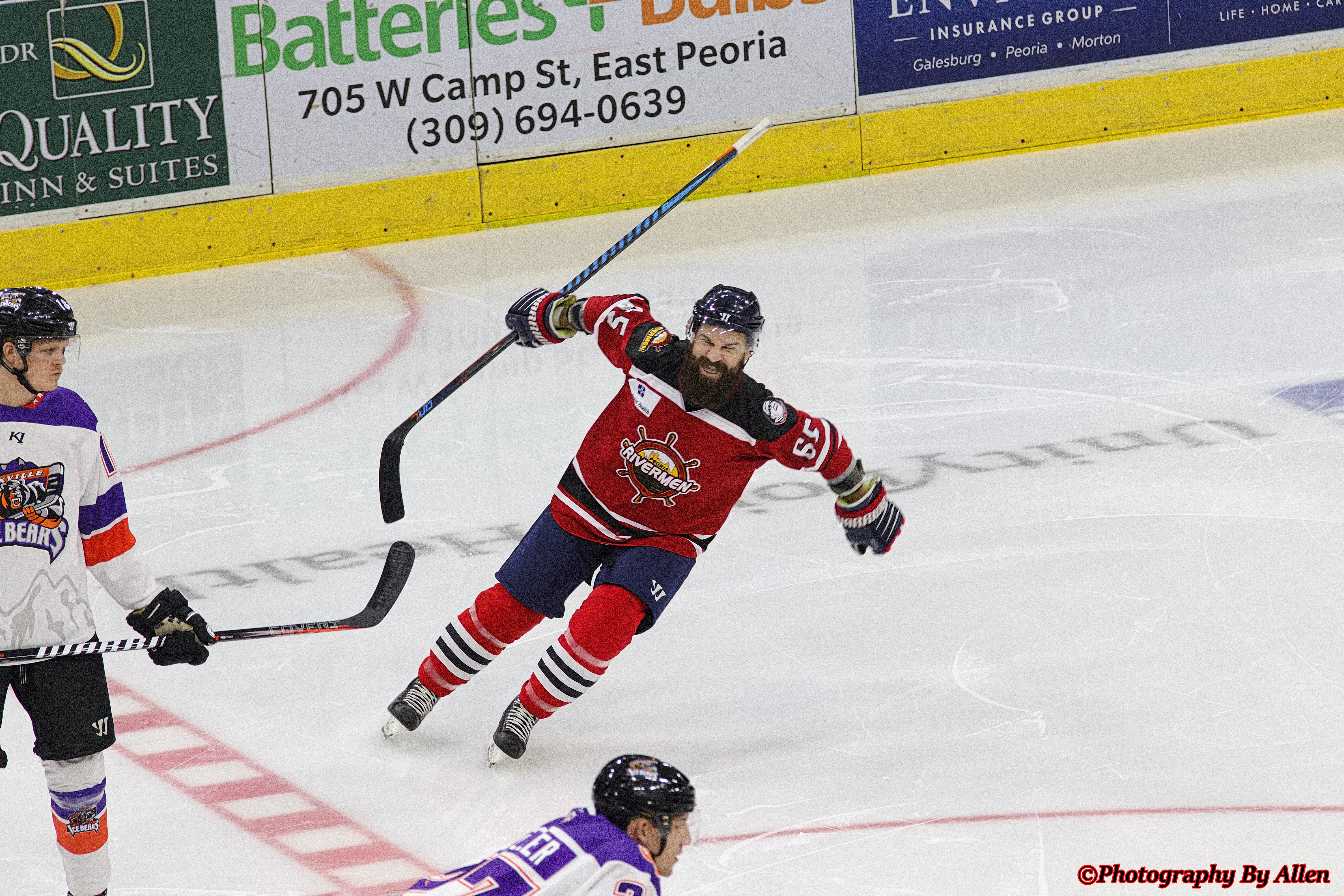 Peoria, IL – The Peoria Rivermen out-shot the Knoxville Ice Bears 38-18 but fell 2-0 to the Knoxville Ice Bears Saturday night at Carver Arena. Peoria’s second consecutive loss, and first regulation loss on home ice this season, drops them to 34-5-6 on the season before tomorrow afternoon’s weekend finale against the Quad City Storm.