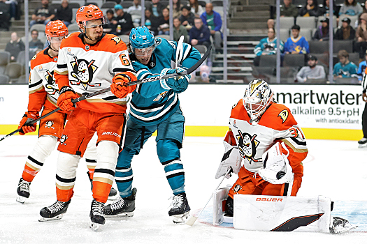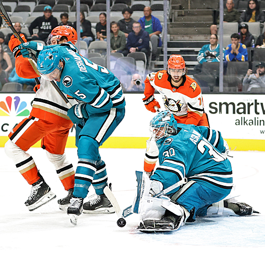 Sharks goalie Yaroslav Askarov blocks the puck as Ducks forward Cutter Gauthier (61) looks for a rebound as Sam Dickinson (6) and Vincent Desharnais (5) defend – Photo by Jack Lima