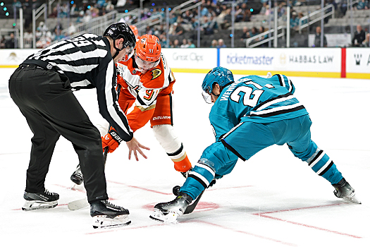 Linesperson Joe Mahon (89) drops the puck on a faceoff between Leo Carlsson (91) and Alexander Wennberg (21) – Photo by Jack Lima