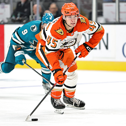 Sharks goalie Yaroslav Askarov blocks the puck as Ducks forward Cutter Gauthier (61) looks for a rebound as Sam Dickinson (6) and Vincent Desharnais (5) defend – Photo by Jack Lima