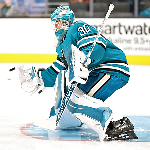 Sharks goalie Yaroslav Askarov makes a kick save as defenseman Vincent Desharnais (5) blocks out Egor Sidorov (left) – Photo by Jack Lima
