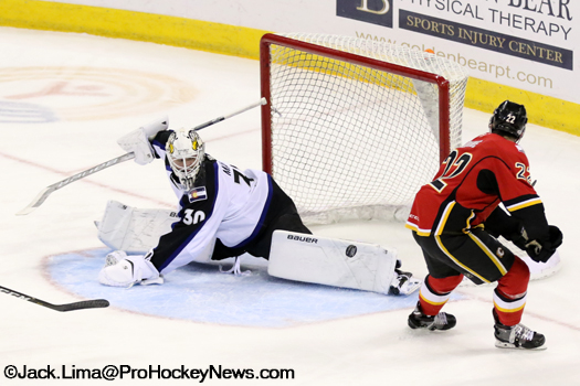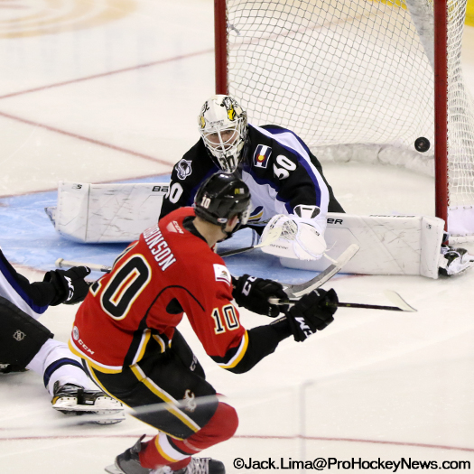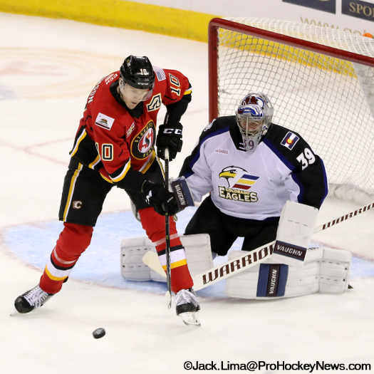 Heat forward Buddy Robinson (10) attempts to tip a shot past Eagles goalie Pavel Francouz (39) – Photo by Jack Lima