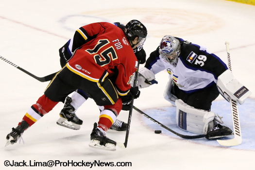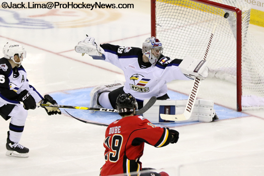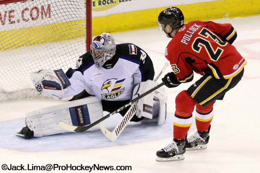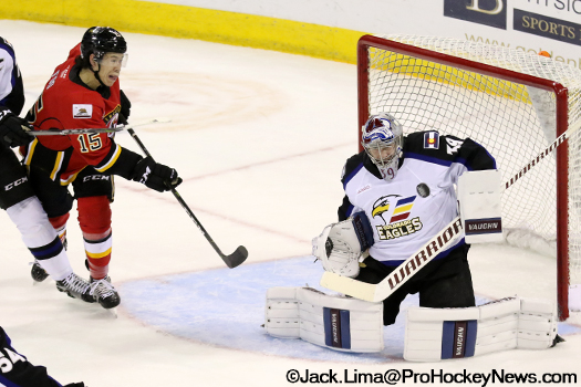 Eagles goalie Pavel Francouz (39) blocks a shot as Spencer Foo (15) looks for a rebound – Photo by Jack Lima