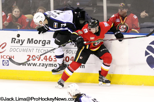 Dillon Dube (19) scores his second goal of the game during third period action Saturday night at the Stockton Arena – Photo by Jack Lima