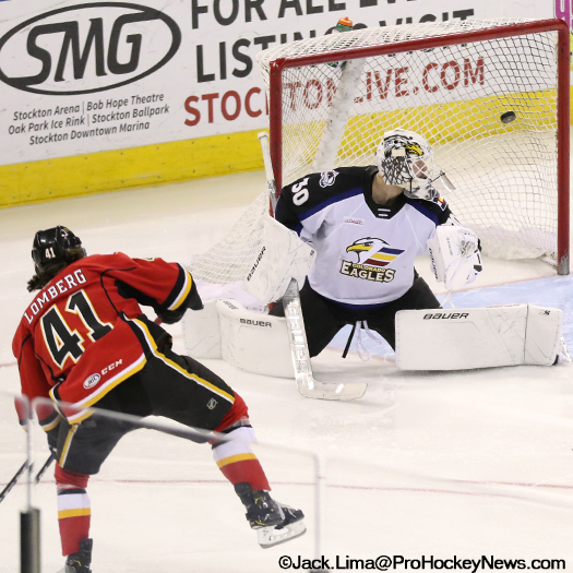Ryan Lomberg score a short handed goal past Eagles goalier Spencer Martin during second period action at the Stockton Arena on Sunday – Photo by Jack Lima