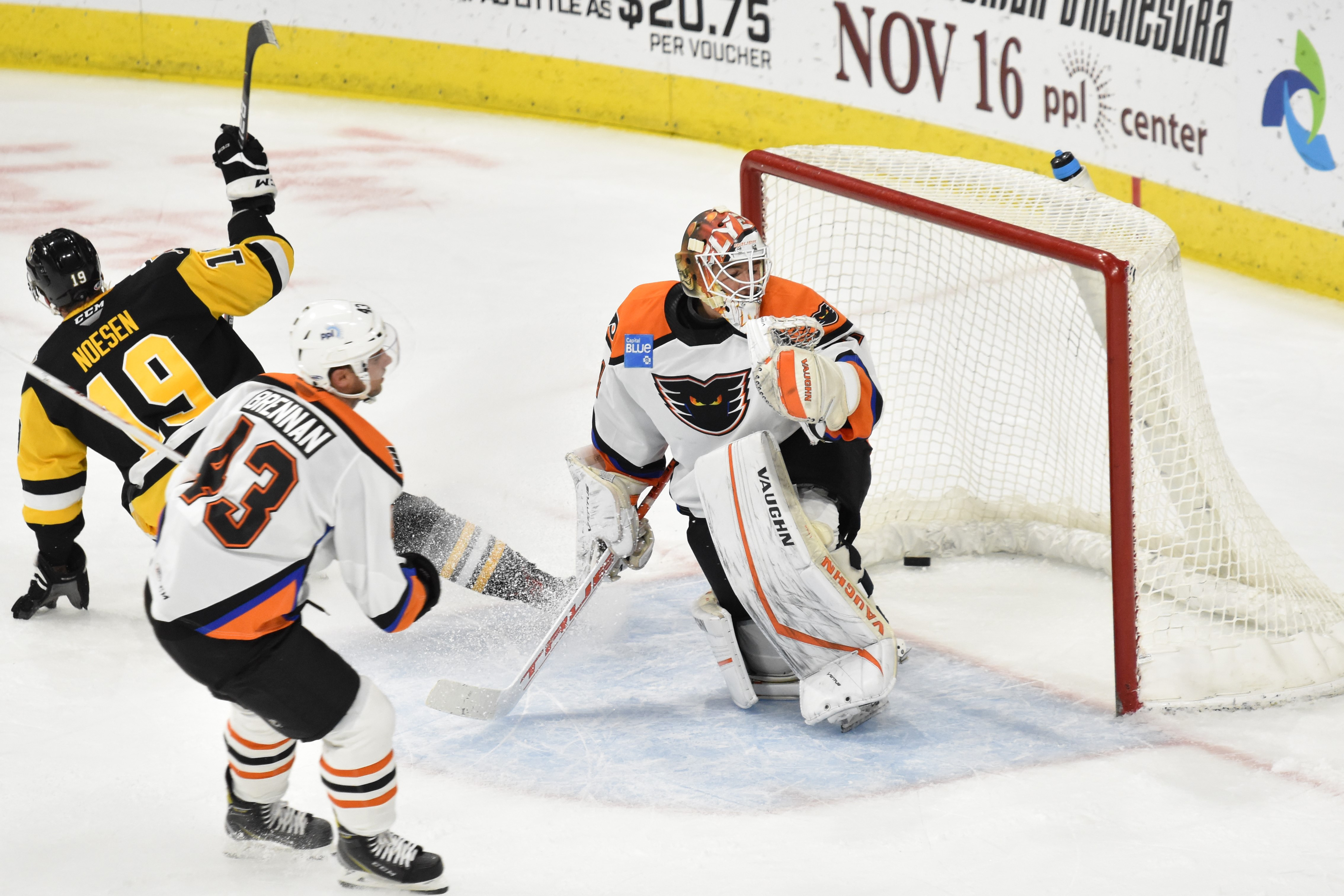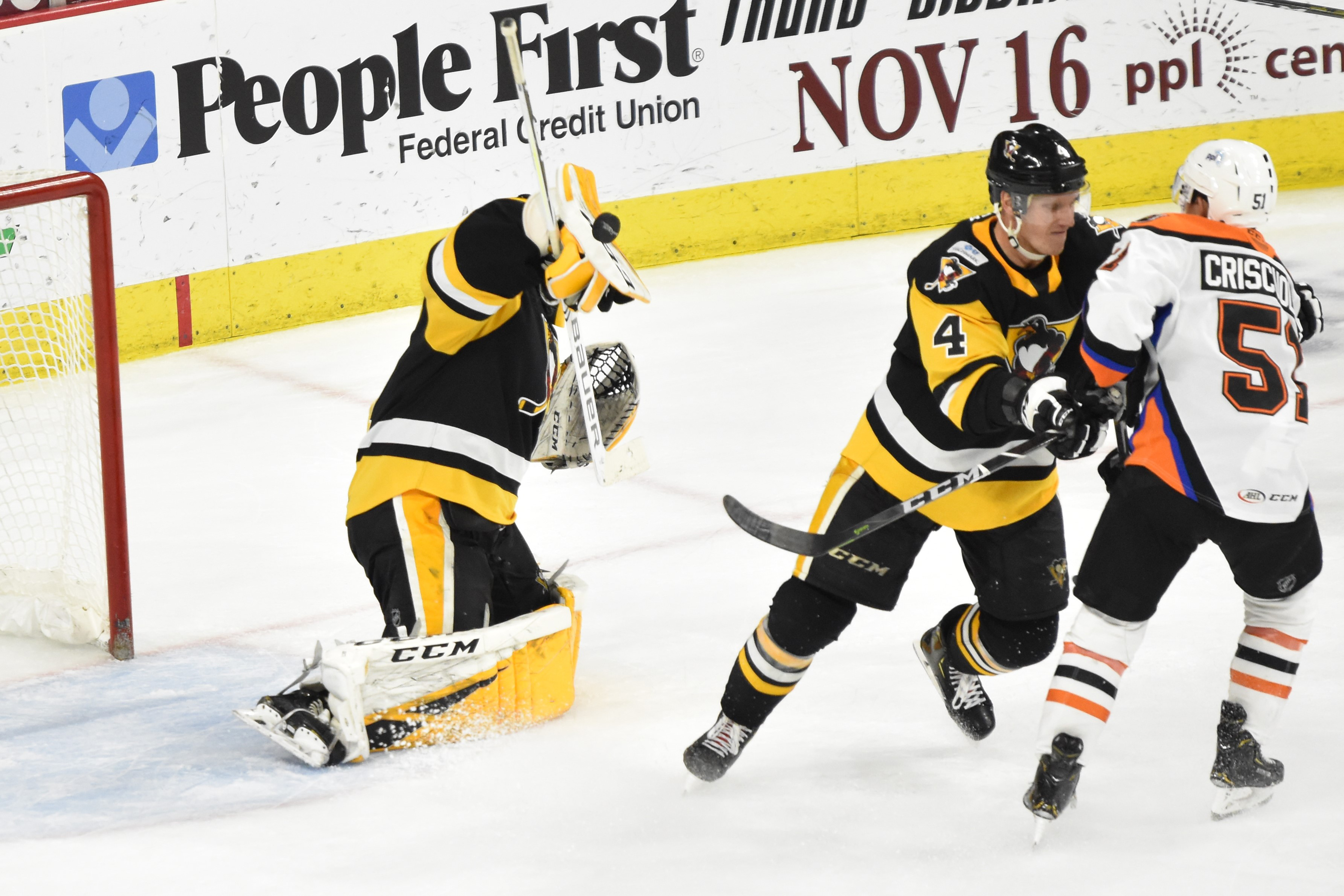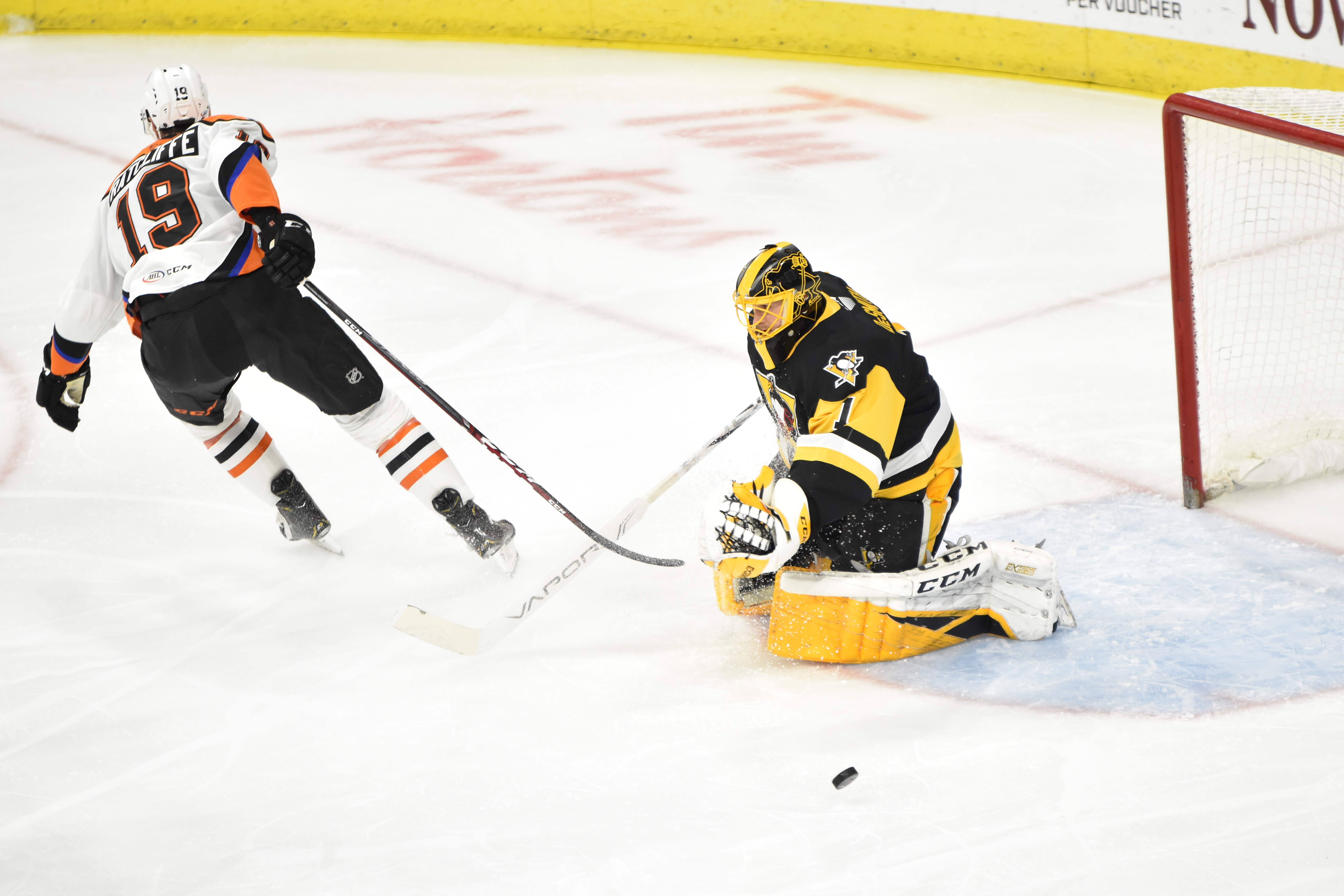 The Phantoms finally got on the board when David Kase deflected an Andy Welinski’s slapshot from near the blue line past DeSmith. The goal cut the Penguins lead to two and made it a 3-1 game. The goal is Kase’s first goal of the season while it’s Welinski’s first assist of the season. Also picking up an assist on the goal was defenseman T.J Brennan, his second of the season.