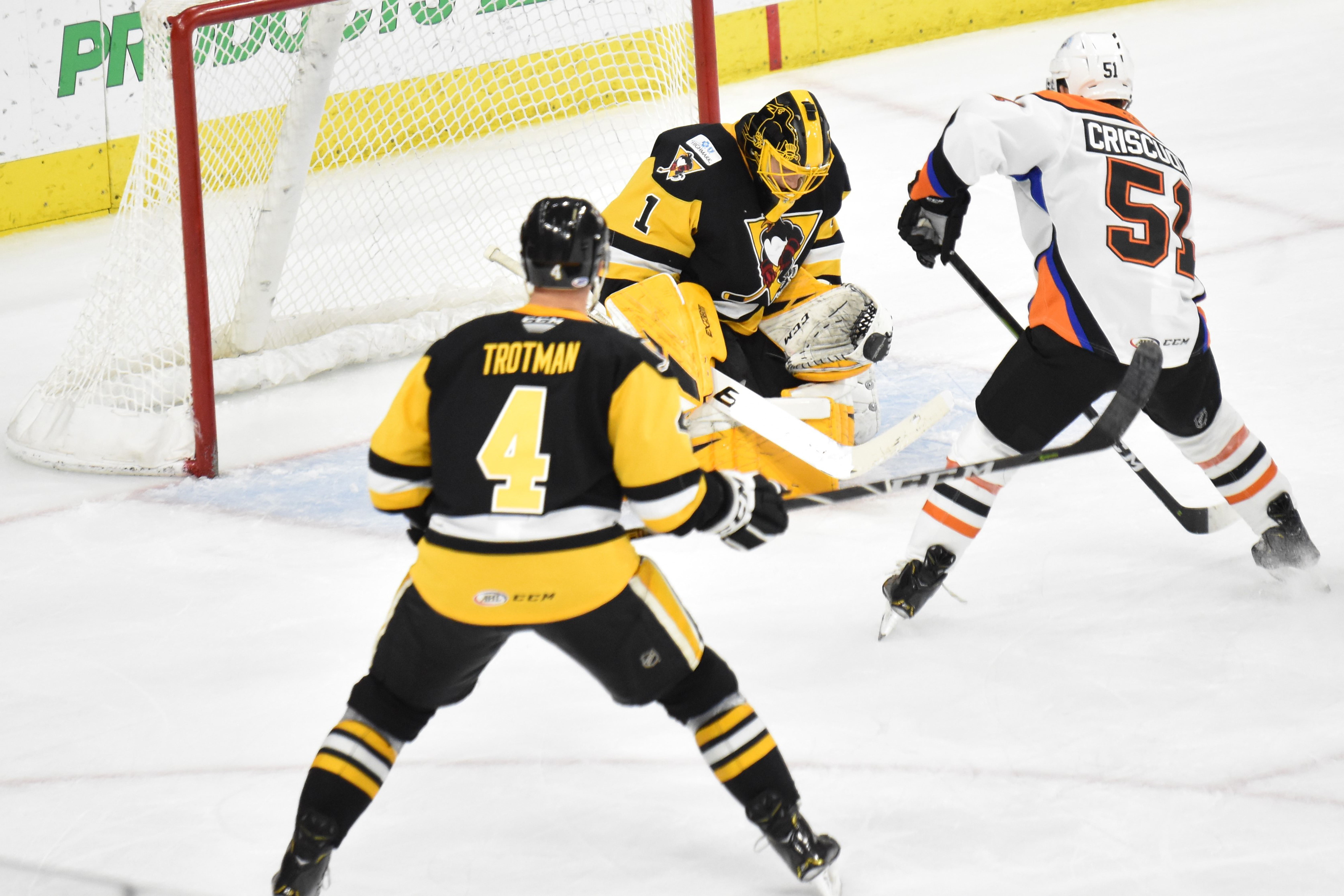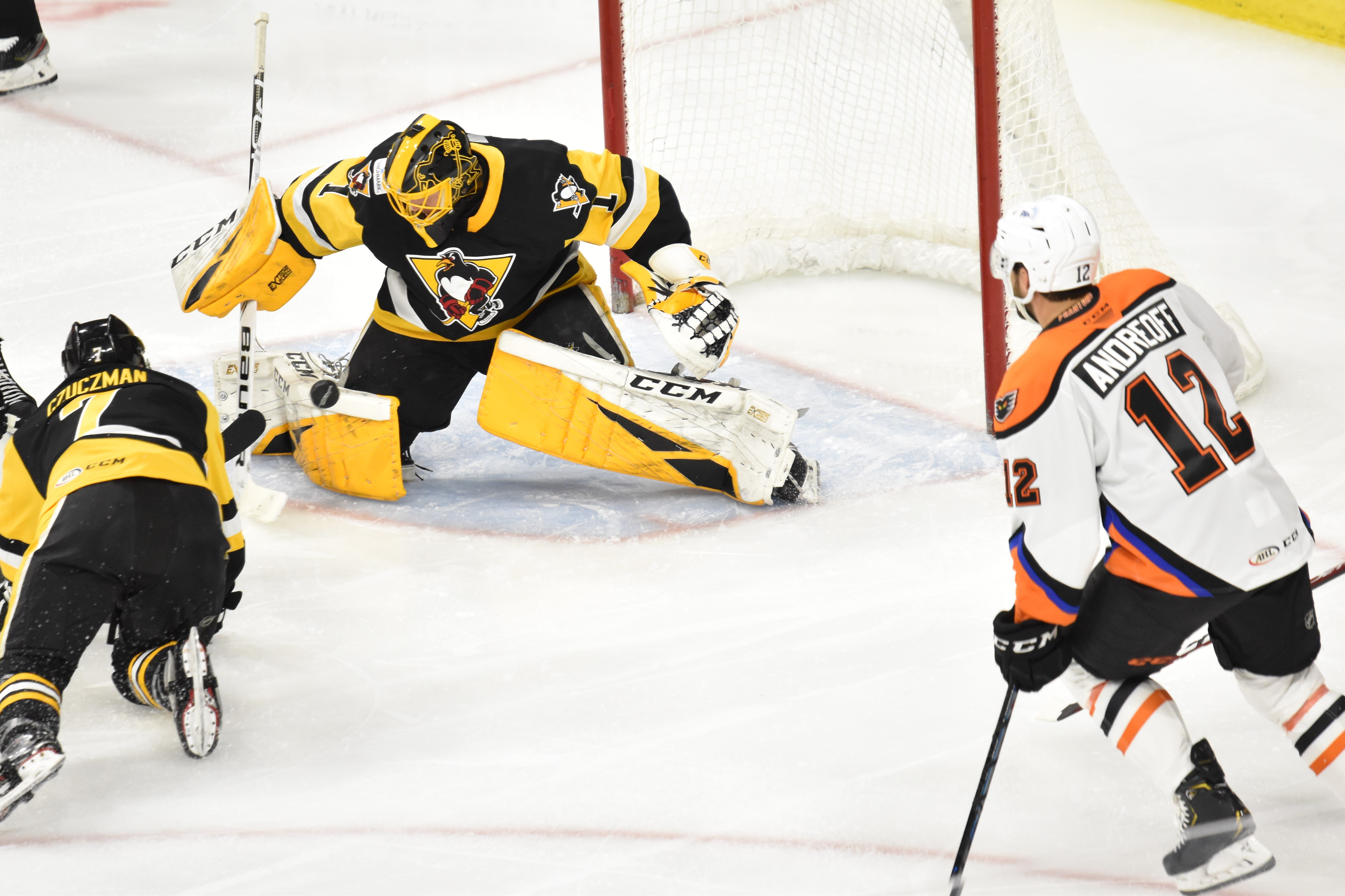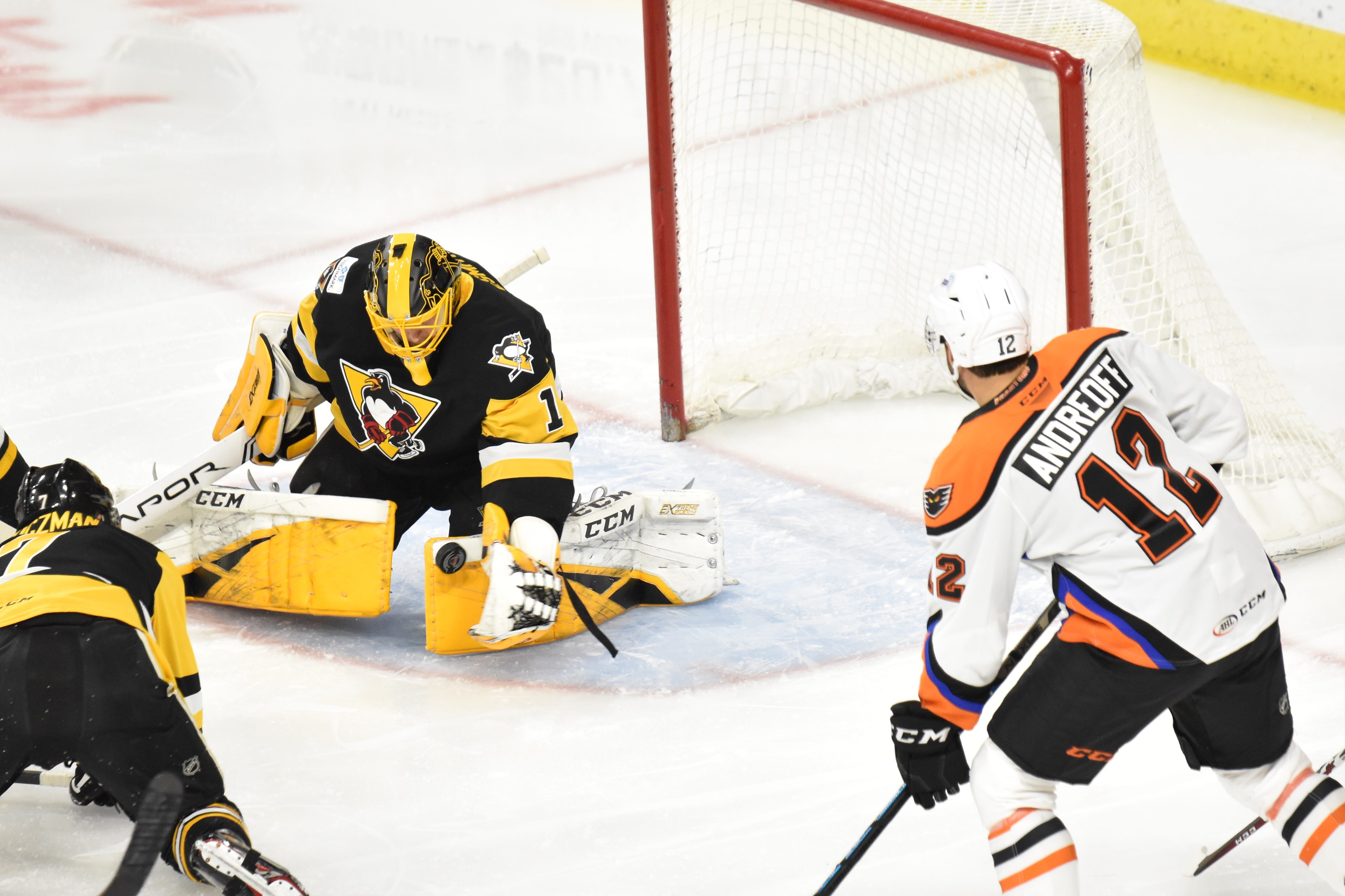 The Phantoms finally got on the board when David Kase deflected an Andy Welinski’s slapshot from near the blue line past DeSmith. The goal cut the Penguins lead to two and made it a 3-1 game. The goal is Kase’s first goal of the season while it’s Welinski’s first assist of the season. Also picking up an assist on the goal was defenseman T.J Brennan, his second of the season.