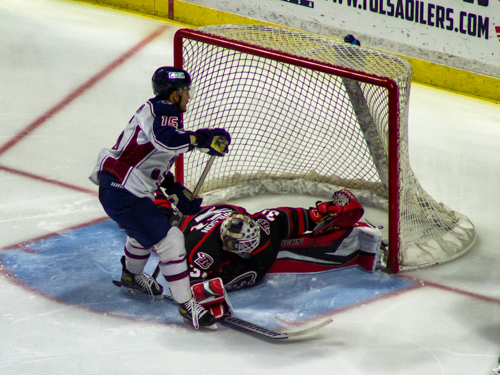 Tulsa Oilers forward Eddie Mattsushima (15), Rapid City Rush goalie Adam Carlson (31)