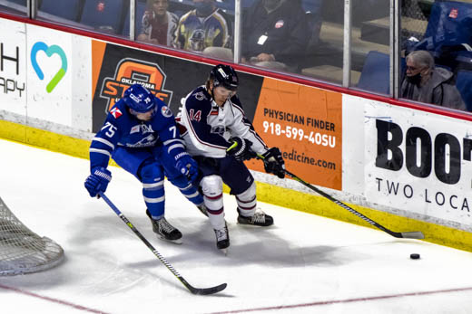 Wichita got on the board first with 12:22 left in the second period. Curran stole the puck at the red line, skated down on a two-on-one and dished it across to Petruic for his first goal as a pro. With 10 seconds to go in the frame, Gennaro raced after a loose puck, got behind the defense and made it 2-0 with a shorthanded marker.