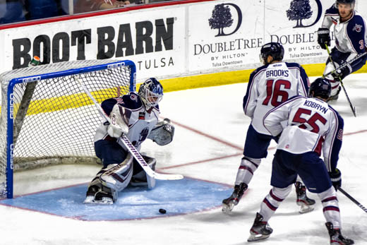 Tulsa cut the lead to one just five minutes into the third as Mike McKee fed a pass to Adam Pleskach near the front of the net and he made it 2-1. Gregg Burmaster tied the game at 12:32 as Darby Llewellyn found him near the crease.After a scoreless overtime session, Wichita played in its first regulation shootout in over a year. The only goal came from Crinella in round one as he tucked it underneath the bar past Devin Williams. Gillam stopped all three shooters he faced to secure the win.