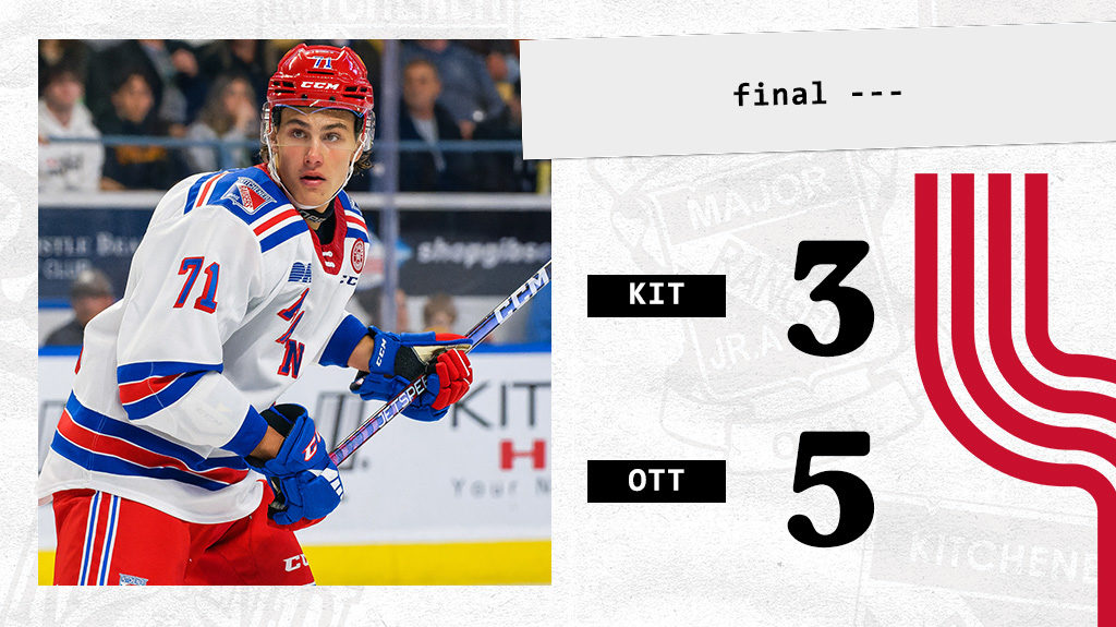 Ottawa, Ont. – Francesco Pinelli scored twice, Kitchener-native Matthew Sop recorded two assists and the Rangers outshot Ottawa 30-27 Friday but the 67’s held on for 5-3 victory at TD Place in Ottawa.