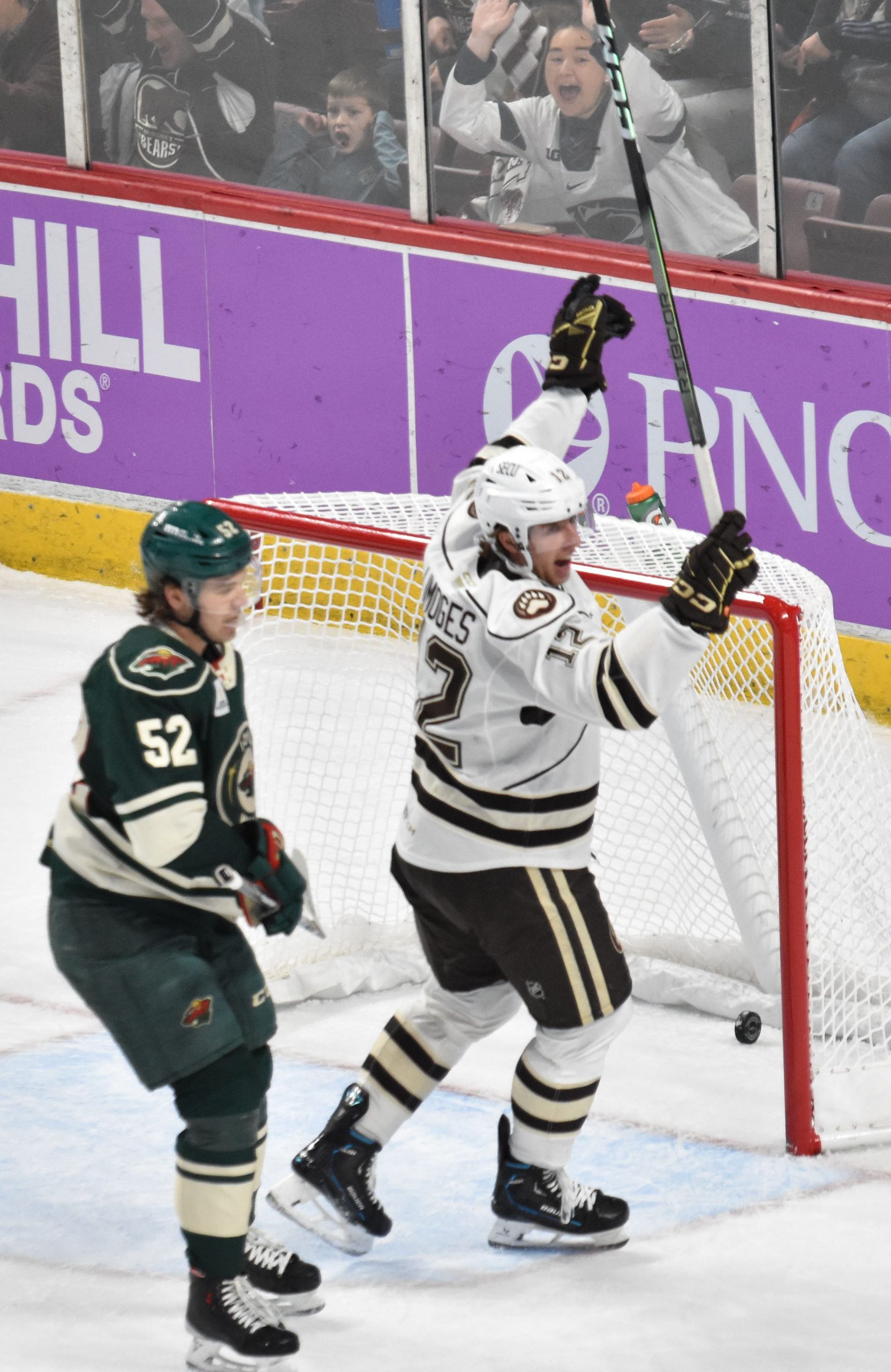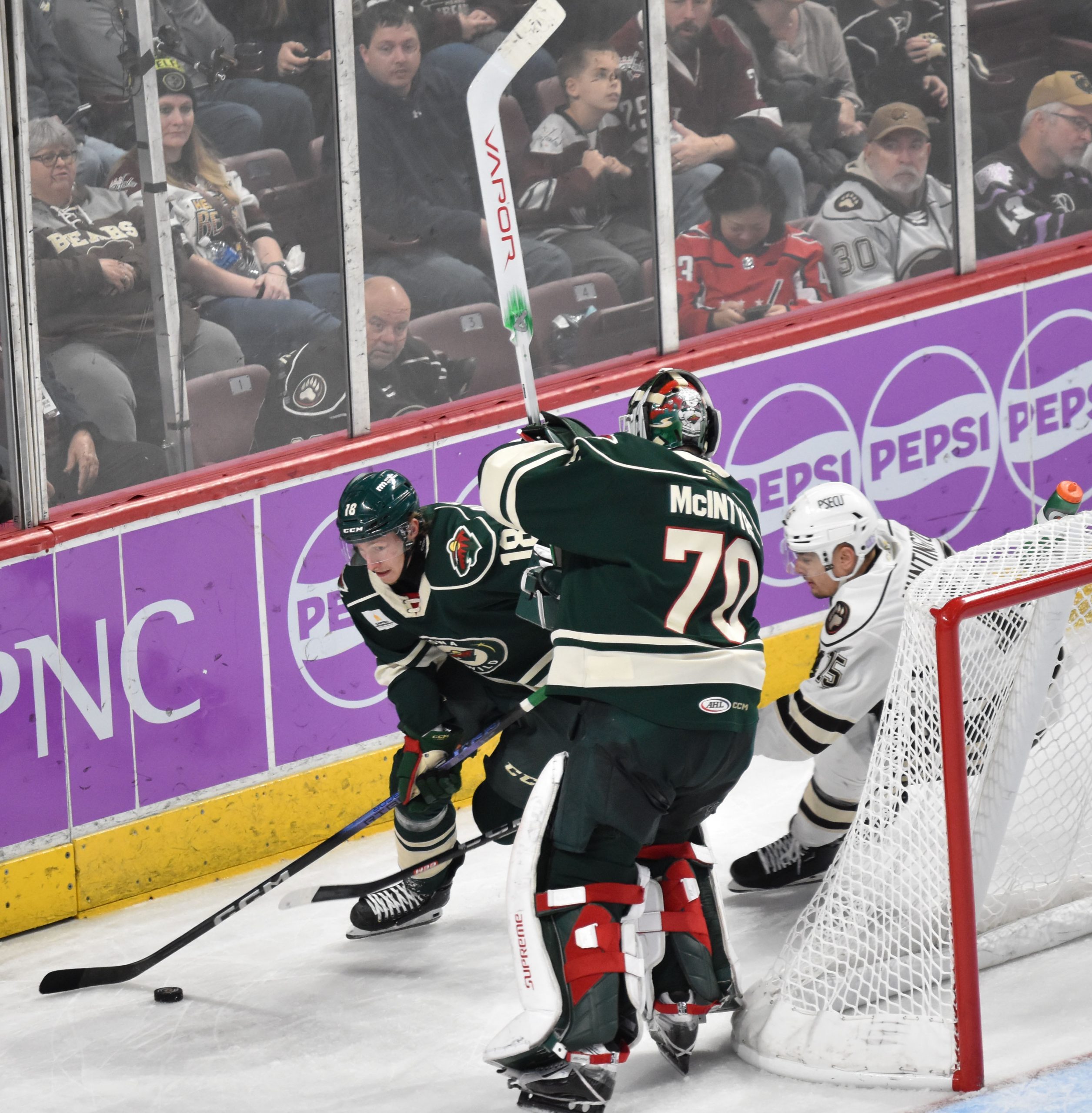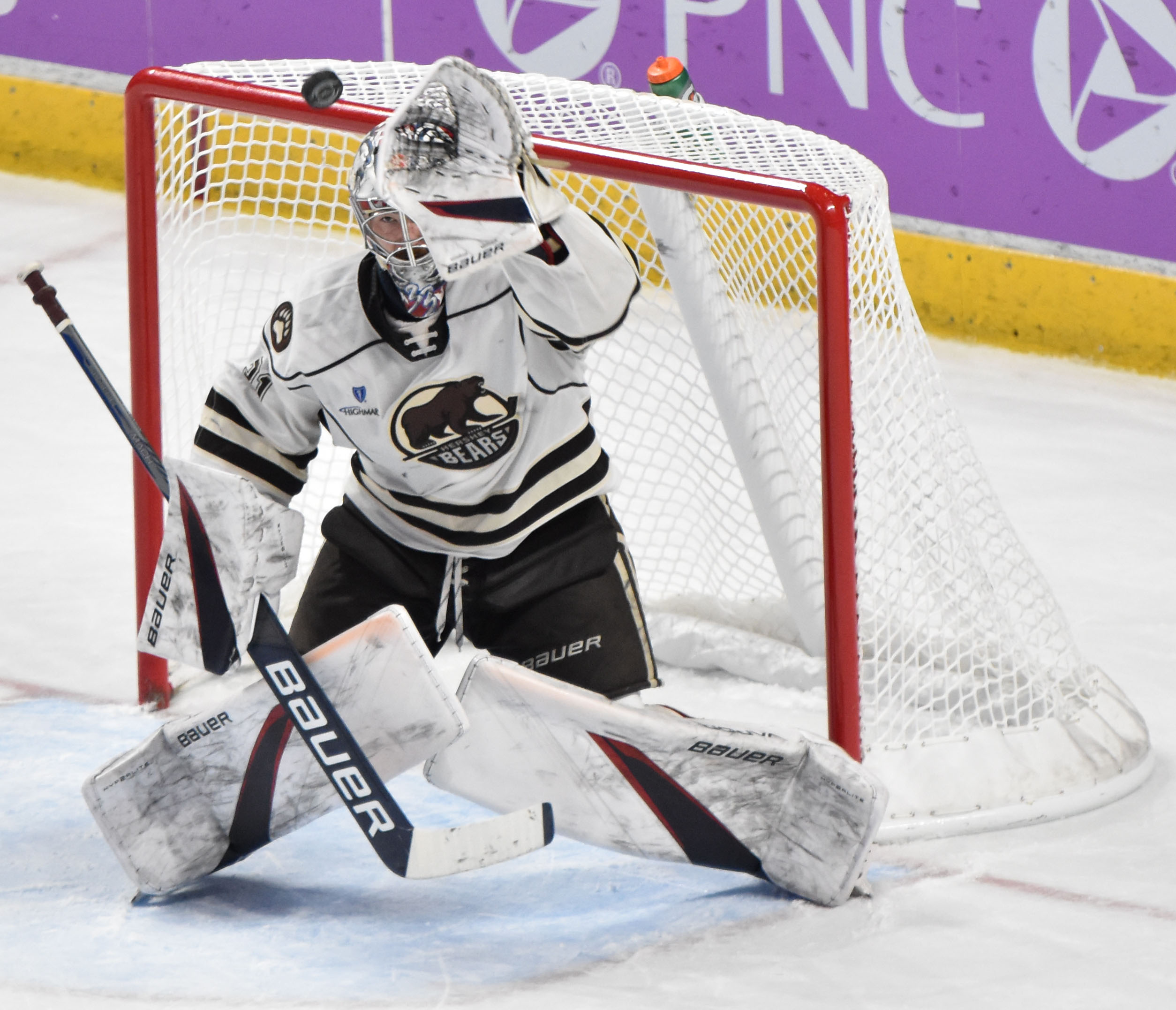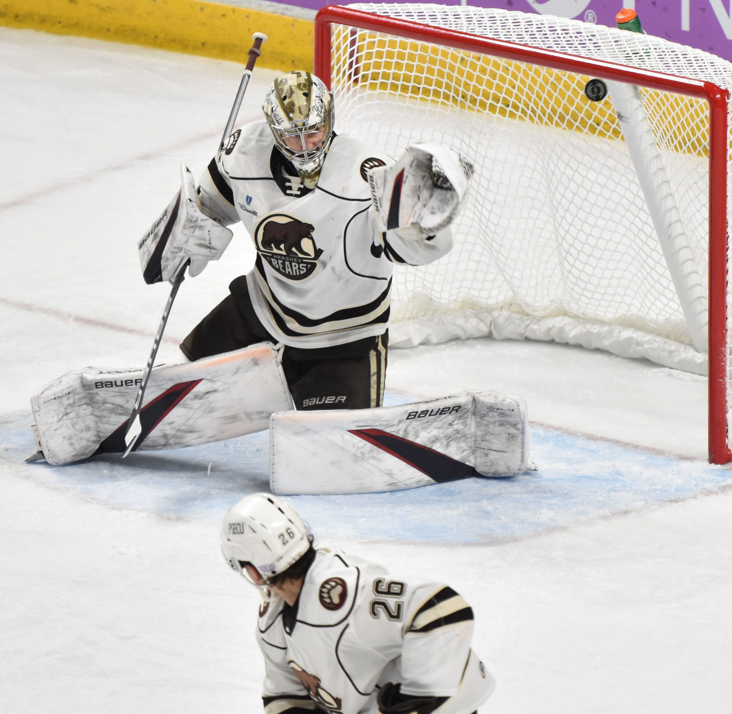 The Bears appeared to take a 3-1 lead with a shorthanded goal at 13:50, but Riley Sutter was deemed to have kicked the puck into the net by the official as Sutter attempted to corral his own rebound, negating the potential goal. A subsequent video review didn’t produce enough evidence for the officiating crew to overturn the decision, and the score remained 2-1 in favor of Hershey.