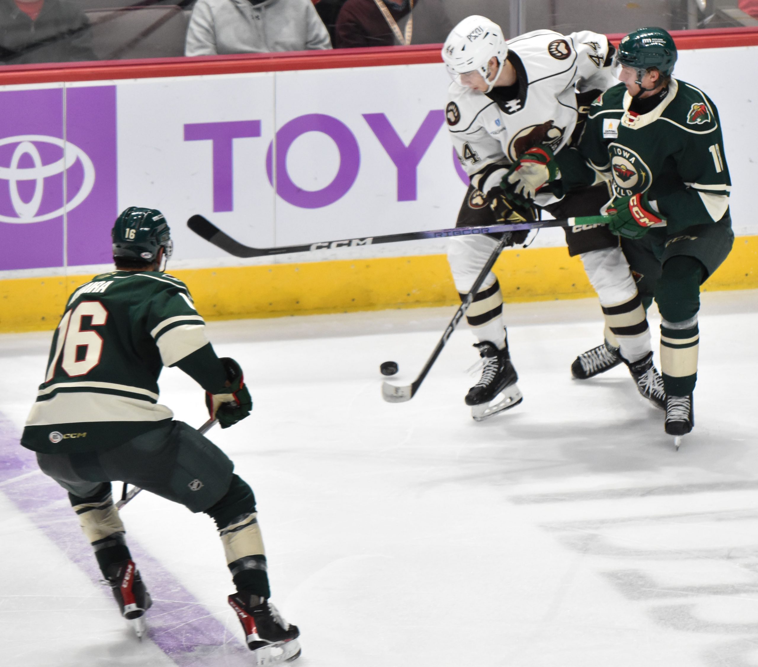 Iowa connected with a power-play goal of its own in the second period when Jake Lucchini managed to redirect Nic Petan’s shot off the crossbar, and it banked into the net past Clay Stevenson at the left post off the equipment of a Bears player at 10:31.