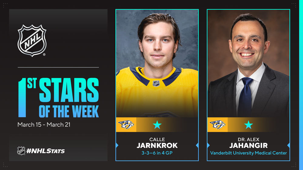NEW YORK – Nashville Predators center Calle Jarnkrok and Vanderbilt University Medical Center (VUMC) Dr. Alex Jahangir have been named the NHL’s “First Stars” for the week ending March 21.