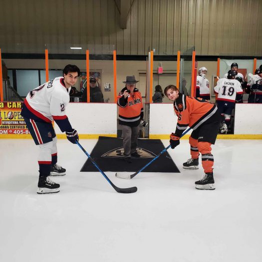 PHN Photographer Les Stockton drops the first puck for the Oklahoma Warriors Feb. 25 NAHL game in commemoration of his 1,000th hockey game he has photographed / Photo courtesy Oklahoma Warriors