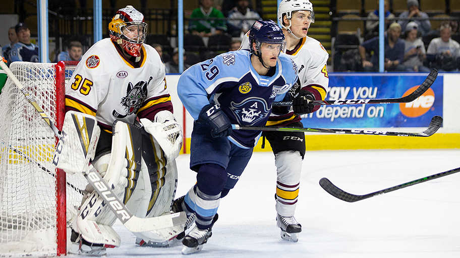 The Wolves jumped out to the lead just 2:29 into the game on Quinney’s ninth goal of the year. Defenseman Zach Whitecloud rimmed the puck all the way around to the left corner for Curtis McKenzie, who backhanded a pass that Quinney took behind the net for a wraparound goal.
