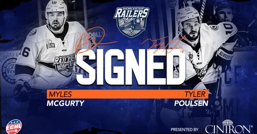 WORCESTER, MA – The Worcester Railers Hockey Club (@RailersHC), proud ECHL (@ECHL) affiliate of the New York Islanders (@NYIslanders), and Railers HC General Manager and Head Coach David Cunniff officially announced today that the club has signed re-signed defenseman Myles McGurty and forward Tyler Poulsen (@lilpoulsen).