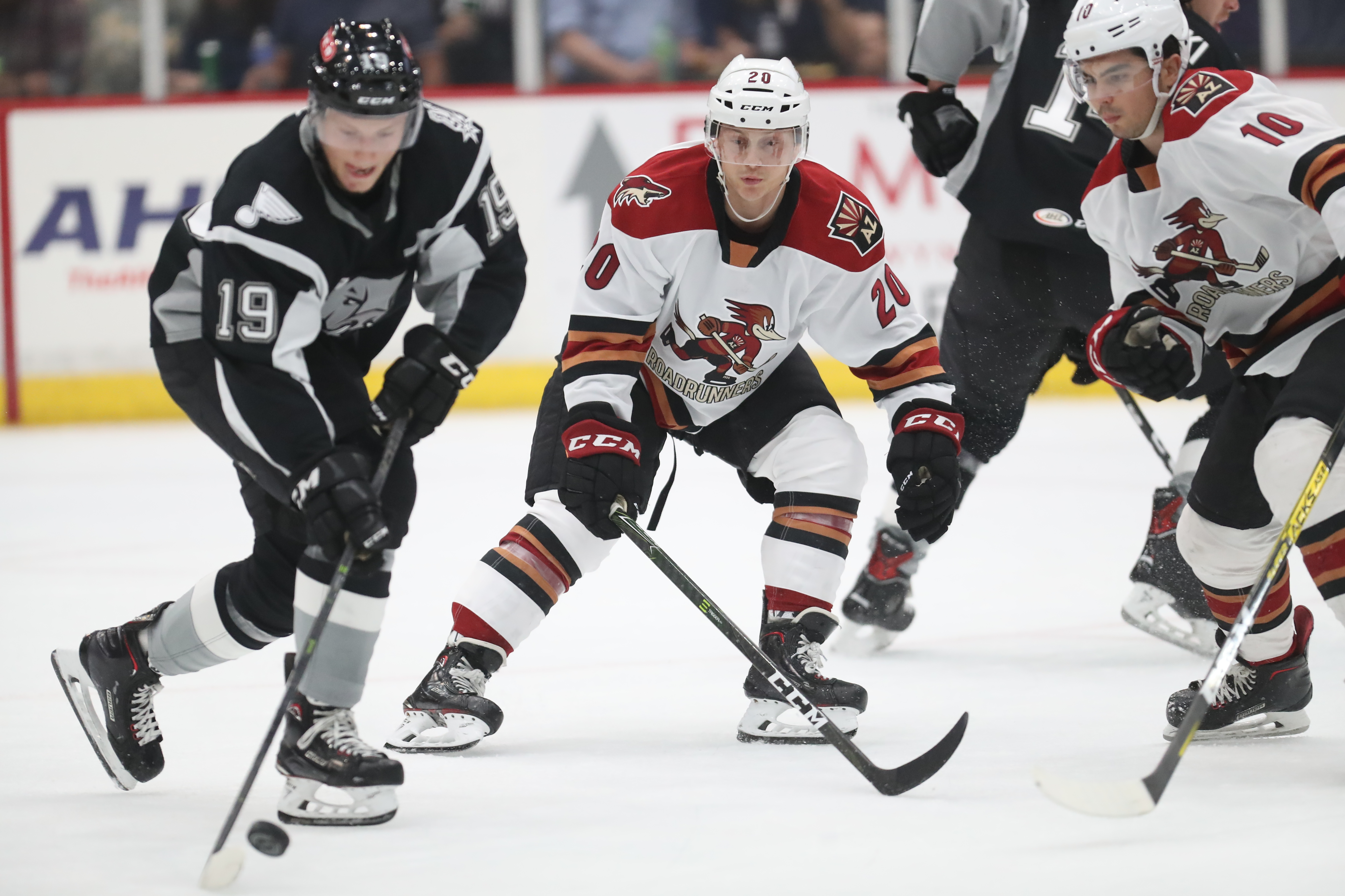At 1:32 of overtime, Miele ended the game with his first goal of the season. Moments after Ryan Olsen disrupted a 2-on-1 Roadrunners rush, Miele scooped up the loose puck in the slot and lifted the puck past Ville Husso’s glove and under the crossbar.
